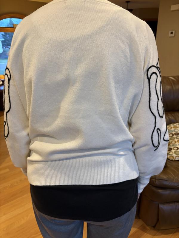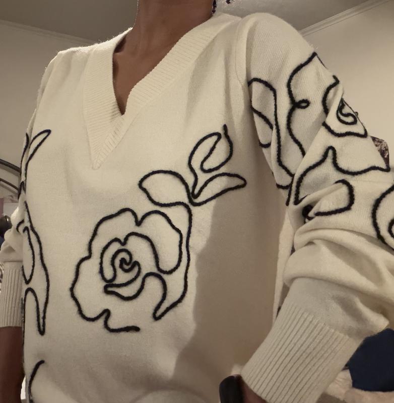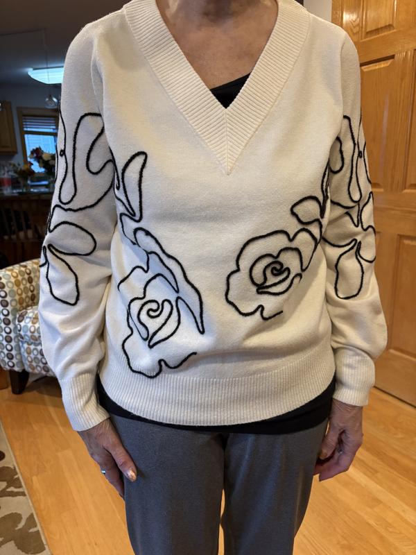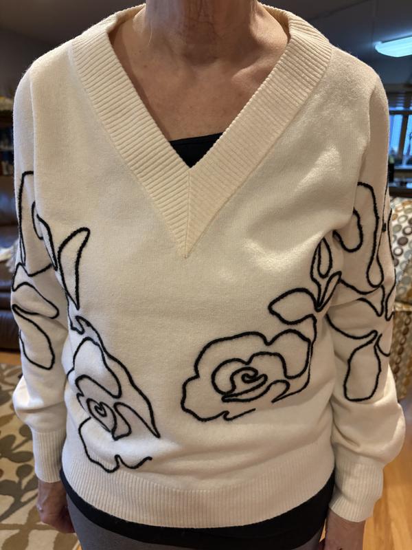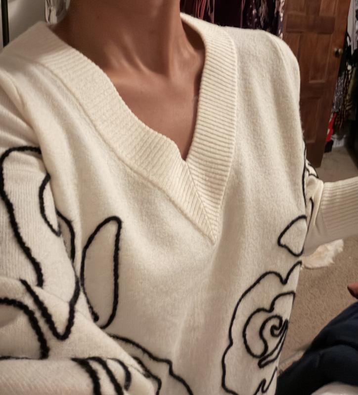 Wow! So much cuter than I thought it would be. Love the V neck of the sweater and the embroidered white design is so subtle but adds alot of character. I got the Petite L and it fits great. A bit short on my longer waist but nice none the least.