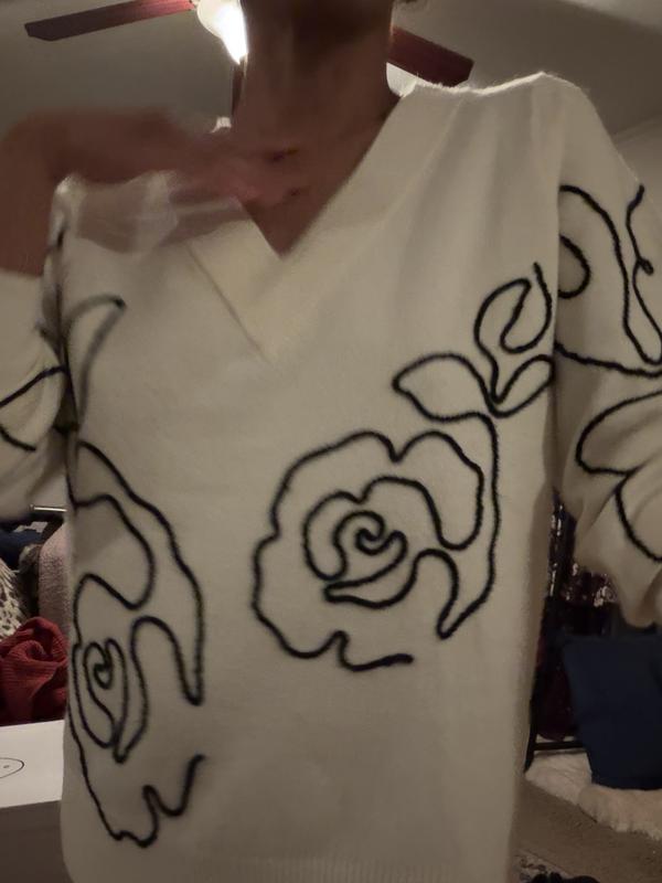 Absolutely beautiful winter sweater in a dark blue color. The flowery detail is so chic that it can be worn for any special holiday occasion. It is so soft that even without layering it is soft and comfy.