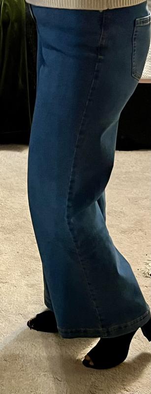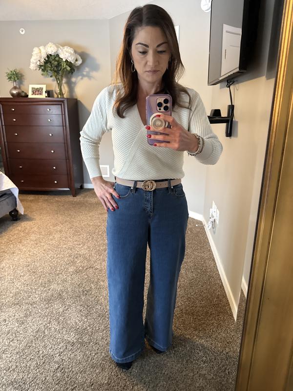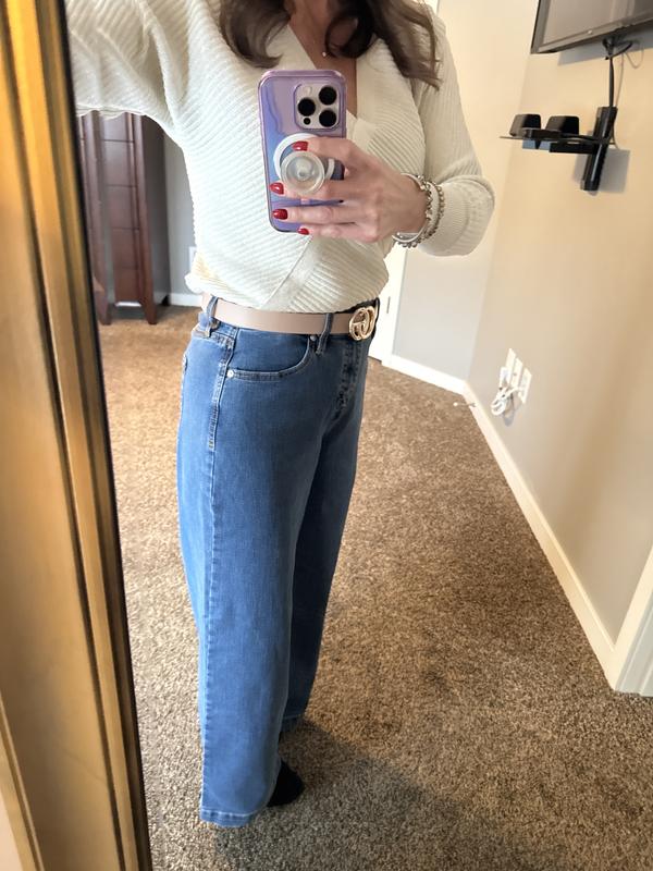 These wide leg jeans lean towards the wider side. The petite length fit perfect for me in a size 6. Do height comparison, I am 5’1”. The material is soft and not scratchy at all. The pockets on the backside are flattering.
