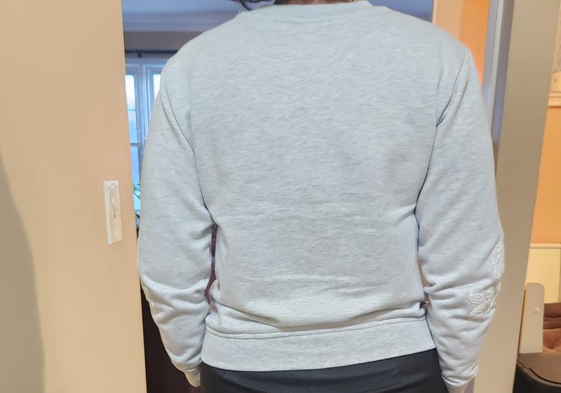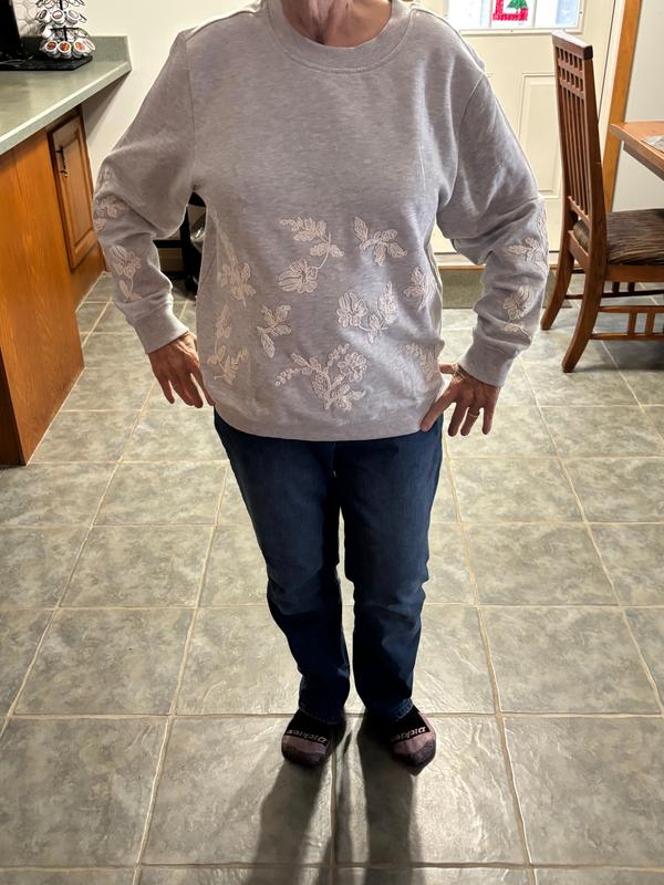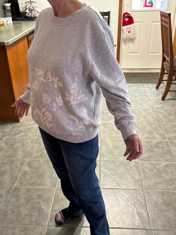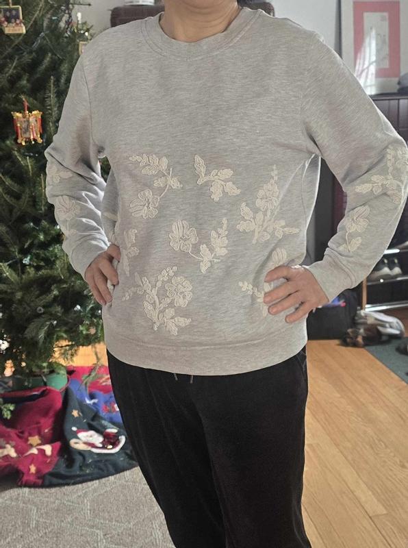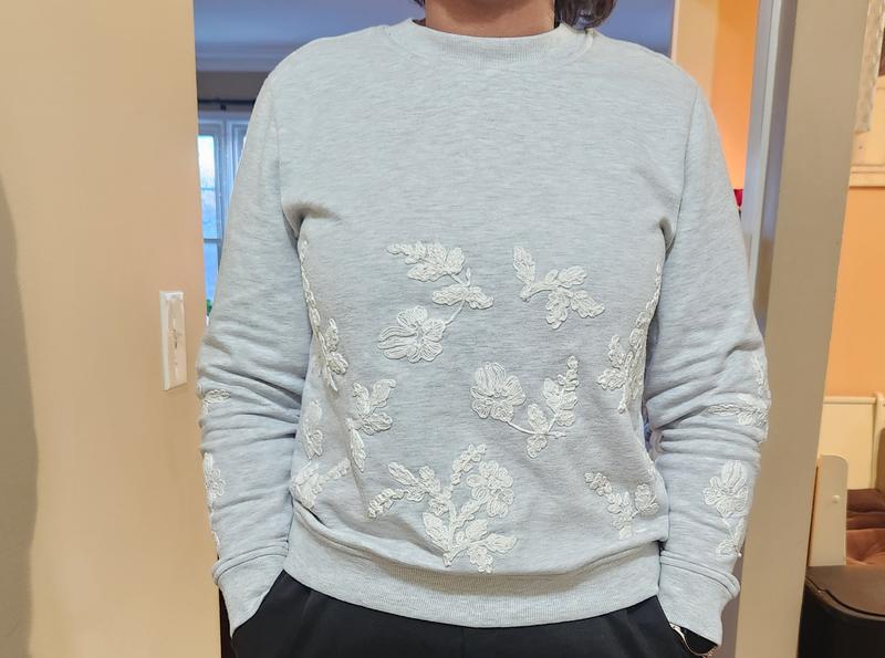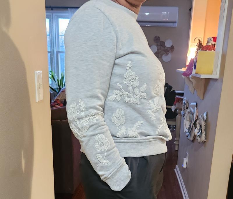 There are so many reasons why I love this sweatshirt. The white floral embroidery is so pretty especially on a heather (light grey) sweatshirt. The fabric is made of 60% cotton & 40% polyester in light/ medium weight. I am really happy with how super soft and comfortable it is, It's also true to size. I will definitely get one more in a different color.