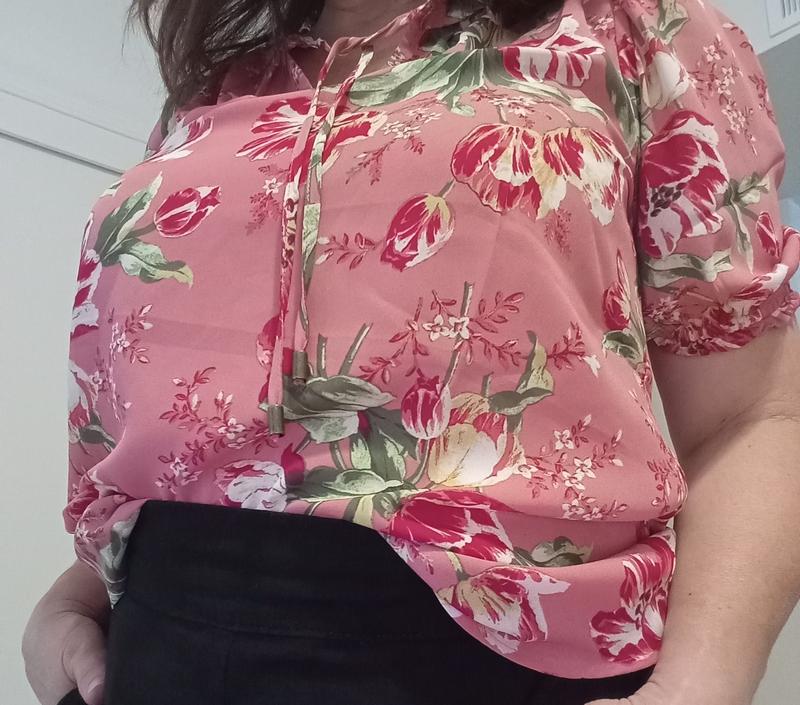 Pretty rosy pink with floral print. Goes nice with white, black and blue denim jeans. It can be dressed up or worn casual. Light weight material, flowy. I live in Florida so fall and spring time is a perfect time of year to wear this top.