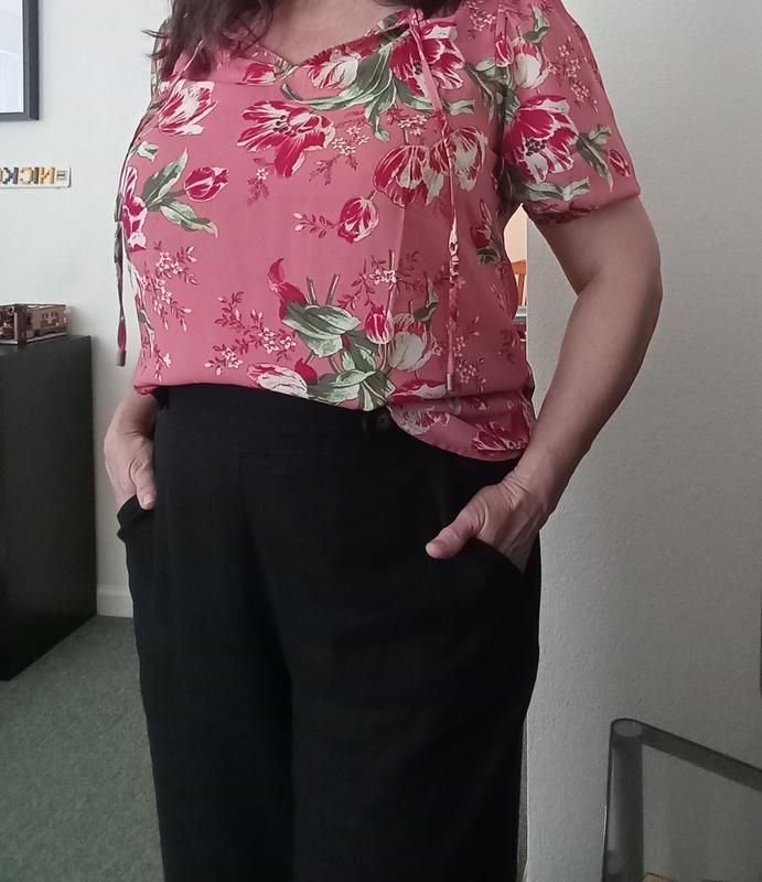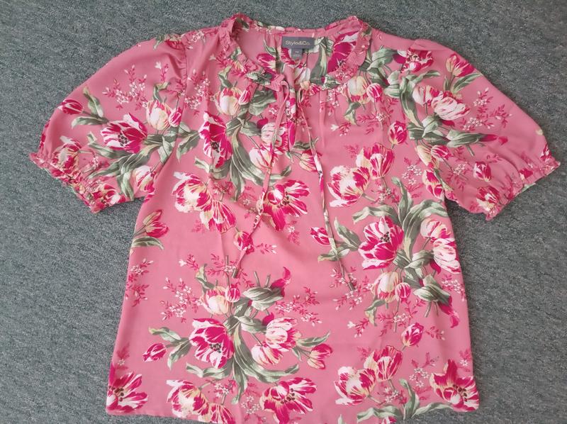 While I like the floral pattern of this blouse, there are some issues. The fabric is 100% polyester which surprised me, as I often purchase Style&co tops, and most of them are made with cotton/viscose/rayon. Also, it runs small in the chest area, so the fabric even bulges. I went for my regular MP but should have gotten LP. In addition, the silhouette widens and I would wear it only tucked in.