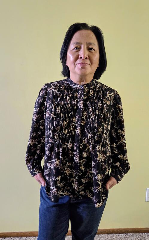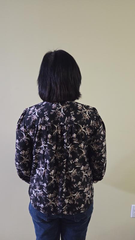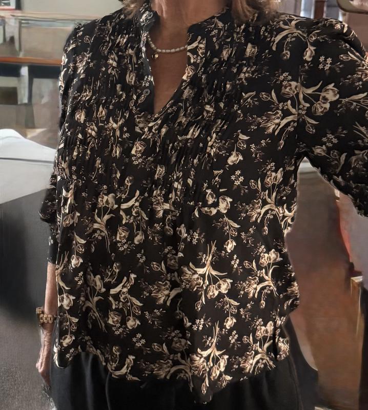 Love the bib design and nice fall color pattern fits true to size and is a nice blouse to transition into fall. Not real long so can wear untucked or tucked in. I liked it better than I thought. looks great with jeans legging and skirts