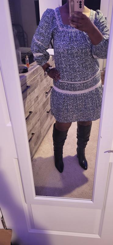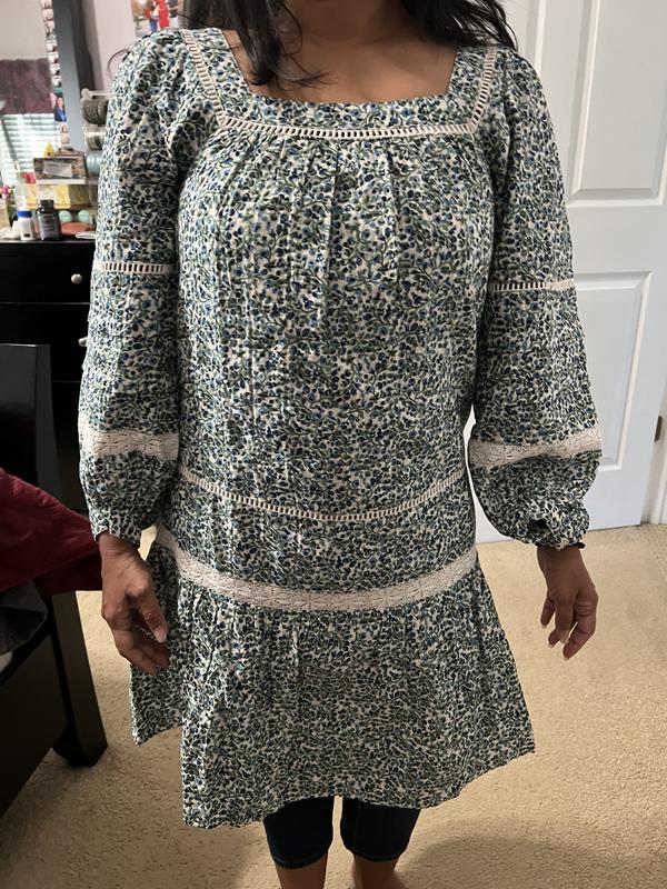 This is the cutest transitional dress. It's perfect for those warmer fall days. It can also be layered with a cardigan and some cute tall boots. I love the print. The flowers aren't too large and green color compliments any skin tone.