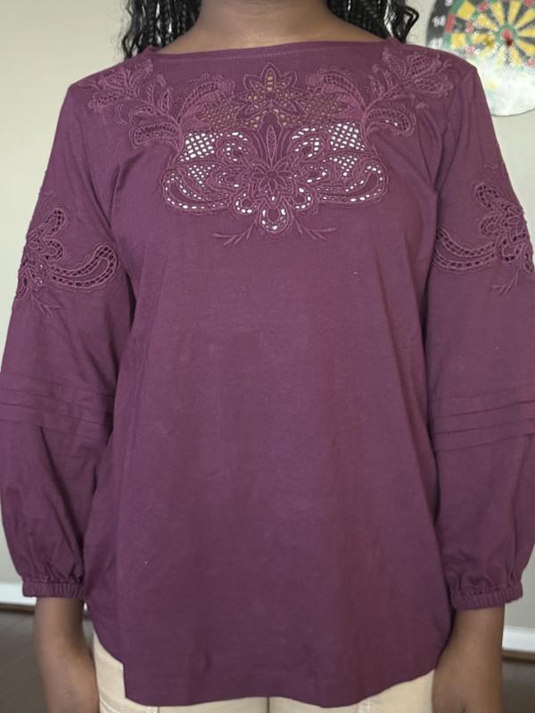 I chose the maroon color for this top. It is very pretty and fits well. Occasionally, I will get a PXL that is tight I. The arms and bust. This top is just fine I wear a 38C if that helps. I’m not sure how it will hold up to being washed yet.