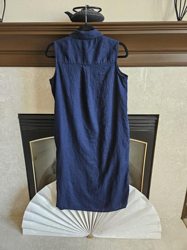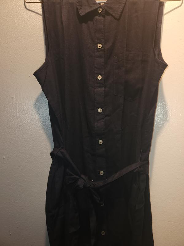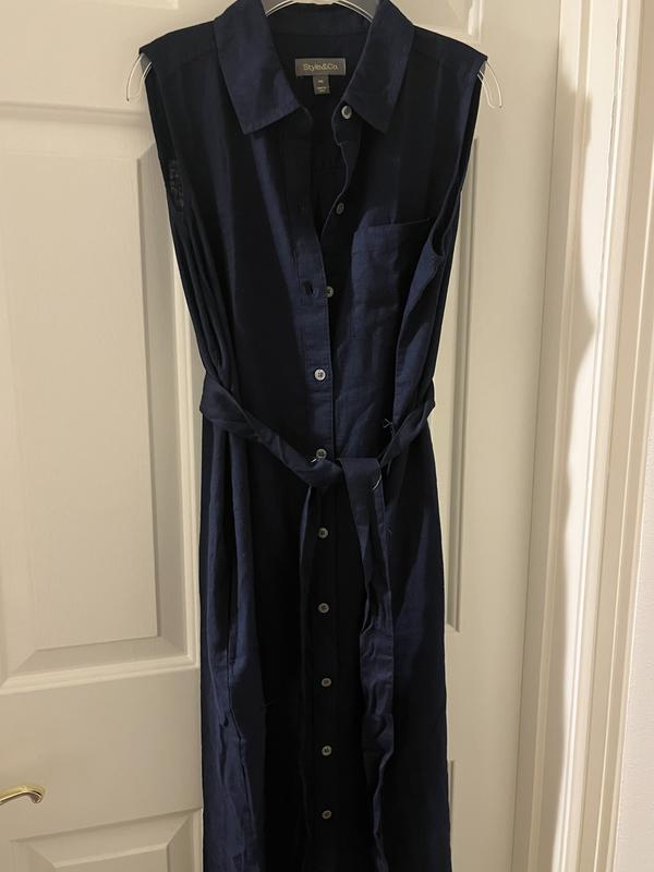 This Style & Co shirt dress looks good, fits well, and is true to size. I like the blue color, the linen blend, and that it is machine washable. However, the fabric is rough on the skin, making it a little uncomfortable. I haven’t washed it yet to know if it will not fade or shrink.