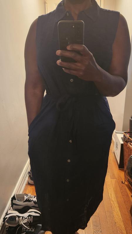 I received the navy blue color in a delightful light linen blend dress that's just perfect for the Spring/Summer season. This midi length makes it an ideal choice for workwear. To elevate the look, I added a gold leather belt for a touch of sophistication. The versatile color of the dress allows for endless accessorizing options. Plus, it fits true to size.