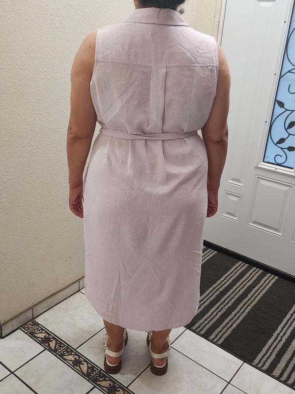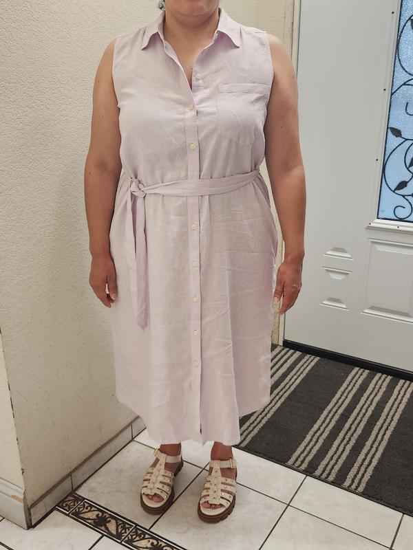 This dress is a lightweight linen dress that is great for summer and hot weather. Even good for work. Beautifully constructed and classic fit. The length is perfect and it can be dressed up or down. No frills. And this lilac / lavender color is just the right hint of color. Just a cute simple shirt dress for summer. I like it.