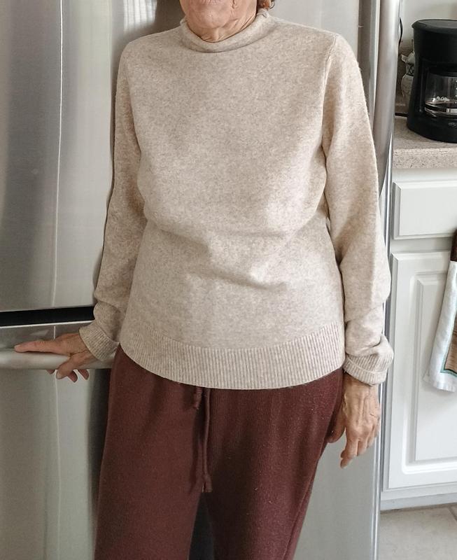 This is a great sweater. The size I received was a petite small. I am under 5 feet and it fit me perfectly. The sleeve length fell at my wrist and the length skimmed my hips.The material is very soft and it is machine washable. The color beige is neutral and would go with many bottoms. The only criticism I have is the rolled neck. I would have preferred a mock neck rather than rolled. The rolled neck didn't seem to stay as it was intended. I would recommend this sweater.
