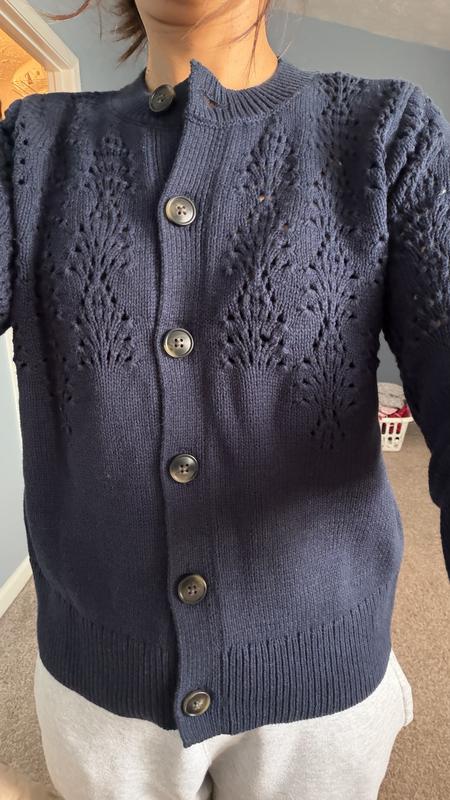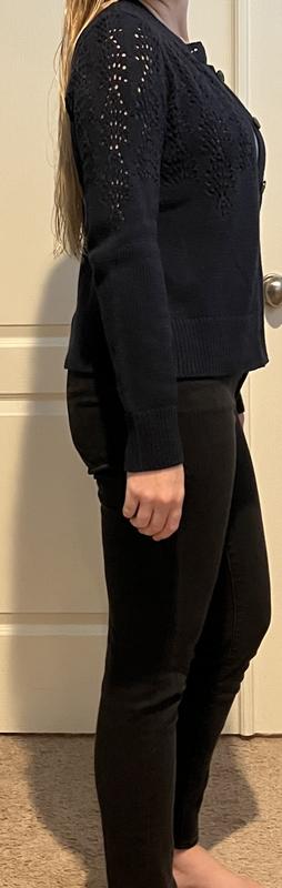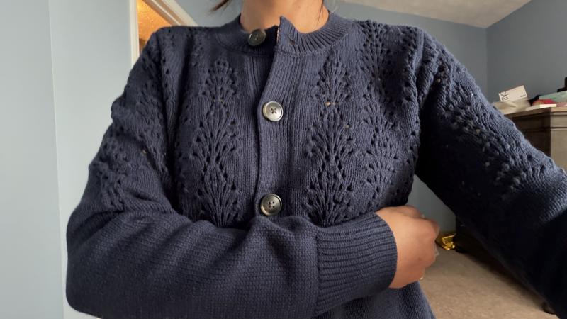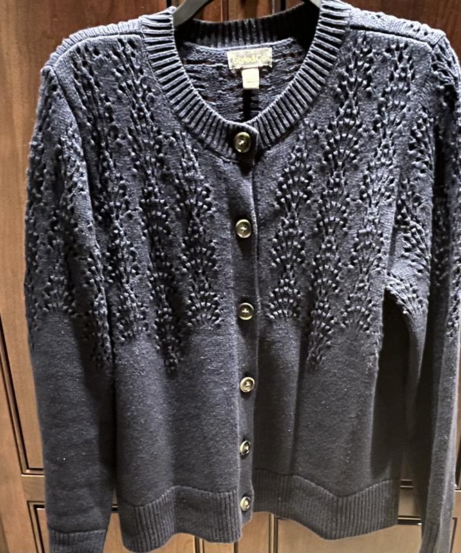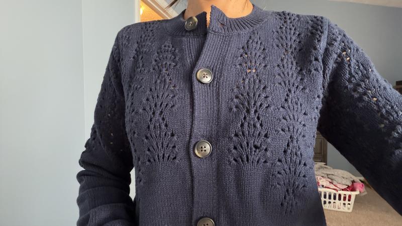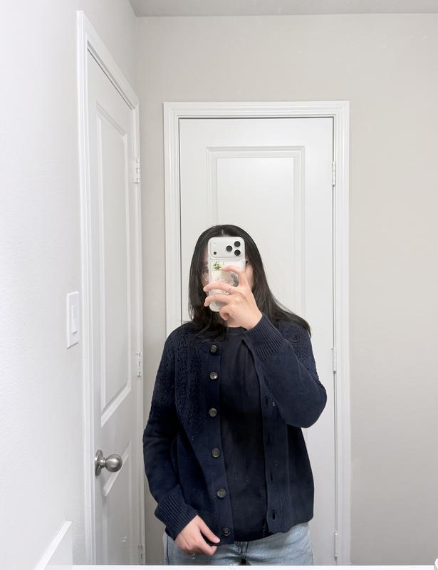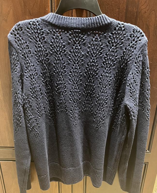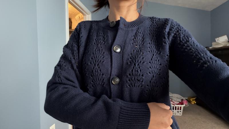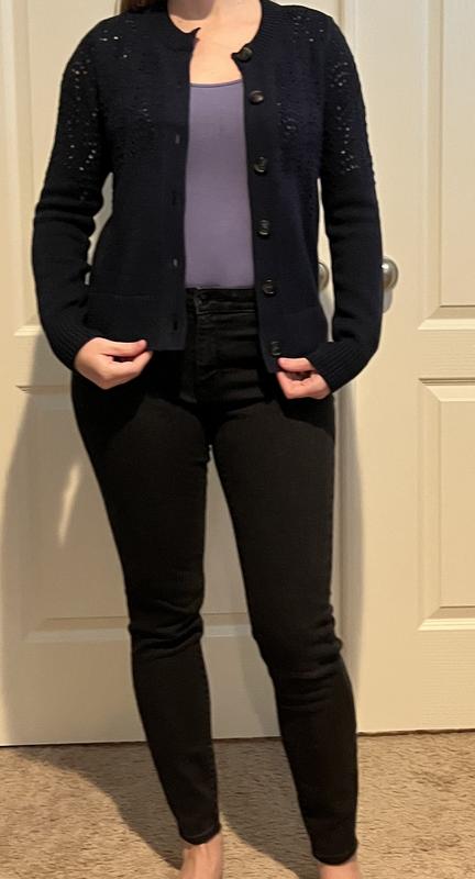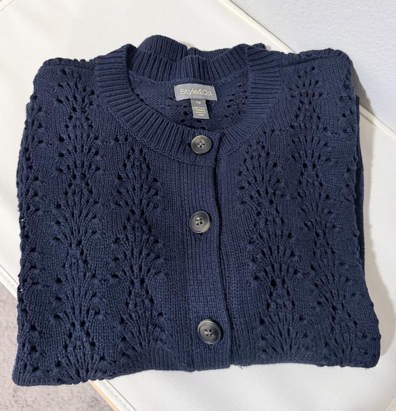 The Style & Co Petite Pointelle-Knit Crewneck Cardigan is absolutely lovely. The pointelle knit design gives it a delicate, feminine look, and the navy color makes it easy to match with so many outfits. It feels cute and comfortable the moment you put it on — not too heavy, not too light. The material seems to be good quality, with a soft texture and a nice amount of stretch. I especially like that it works perfectly with jeans for a casual look, but can also be dressed up a bit for work or outings. It's a great layering piece for fall weather. Overall, it’s a stylish and versatile cardigan and I am happy with it.