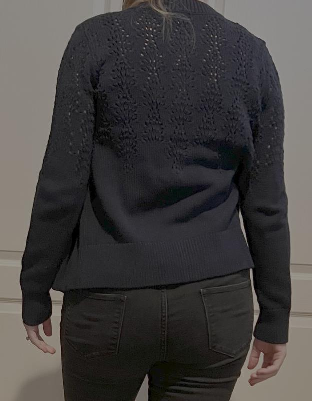Love the navy shade! It goes really well with either dark or light shirts inside. The cut-outs make it a bit breezy, so I wouldn’t wear it on its own, especially when it’s windy. The pointelle detailing really elevates the cardigan. I prefer a looser fit, so I sized up. Definitely a great piece for winter!