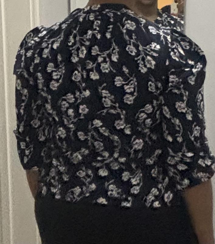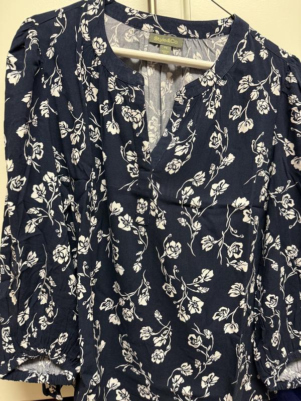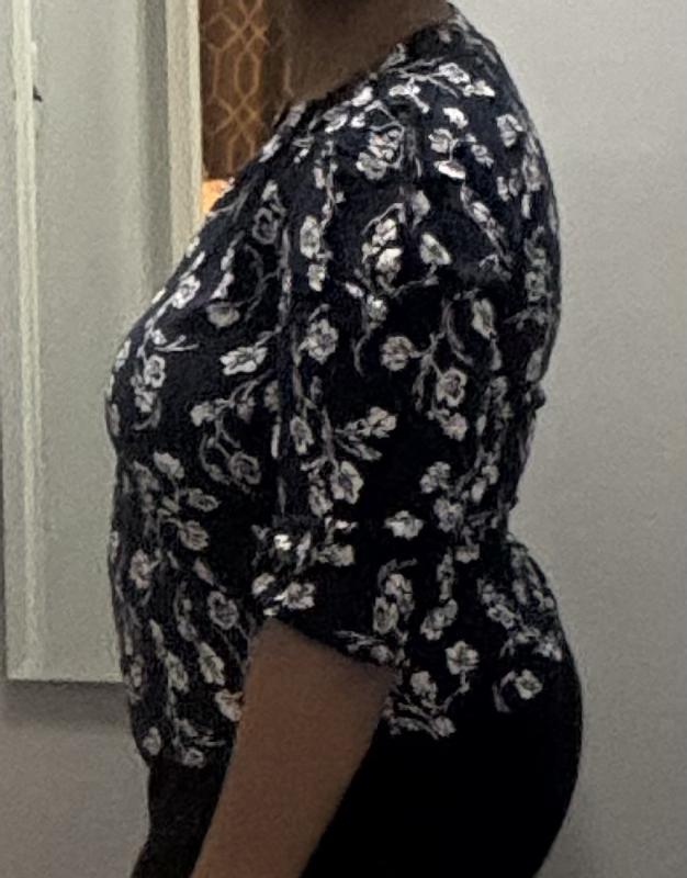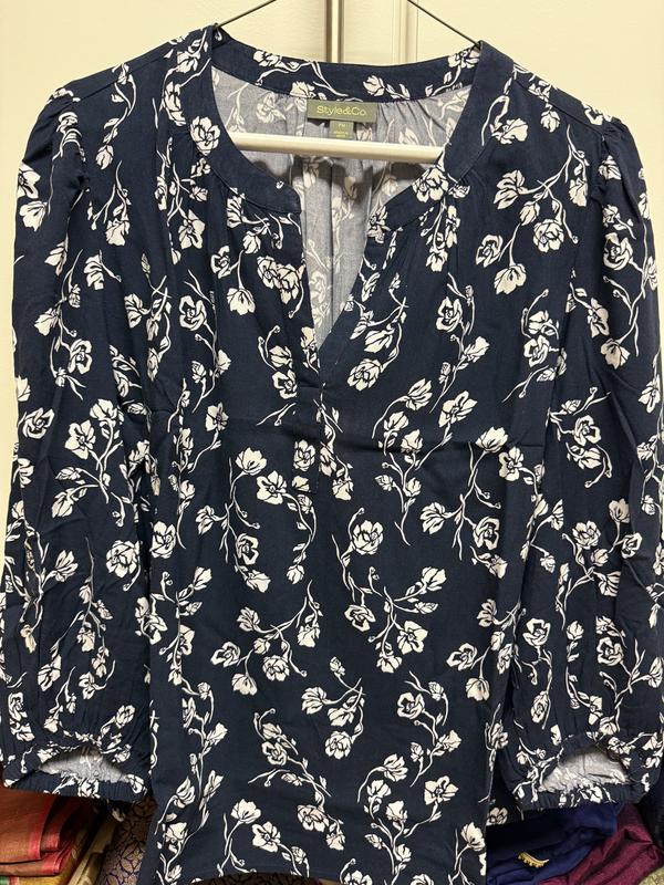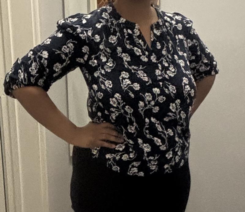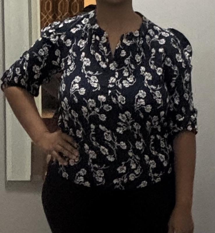 This is a lovely top with a soft and comfortable fabric. The fit is true to size. The color and pattern are perfect. But I’d like to see how well the color holds up after a few washes but overall, I’m happy with the purchase so far.