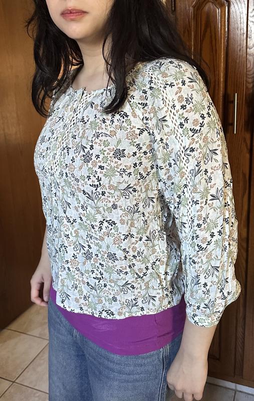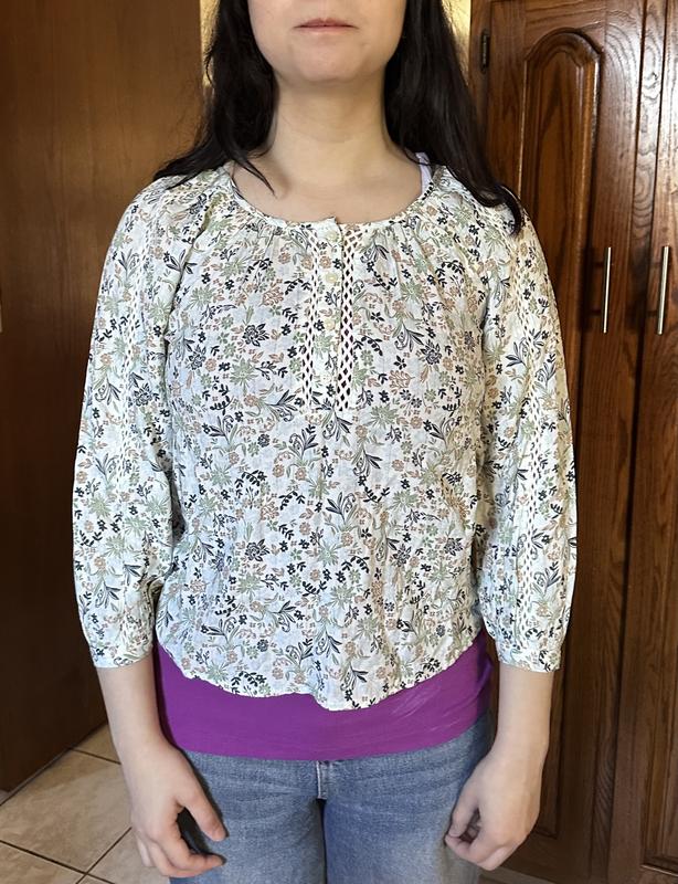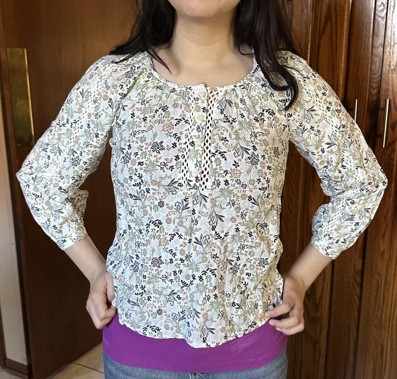 This top is lightweight cotton with a sage green, light blue, black and light brown print. It has some open work design on the placket and down the sleeves. Sleeves are wrist length with narrow cuff and button closure. There is a very thin metallic thread stripe through it. Fits true to size snd hits just above my hip. I am 5ft 2 for reference.