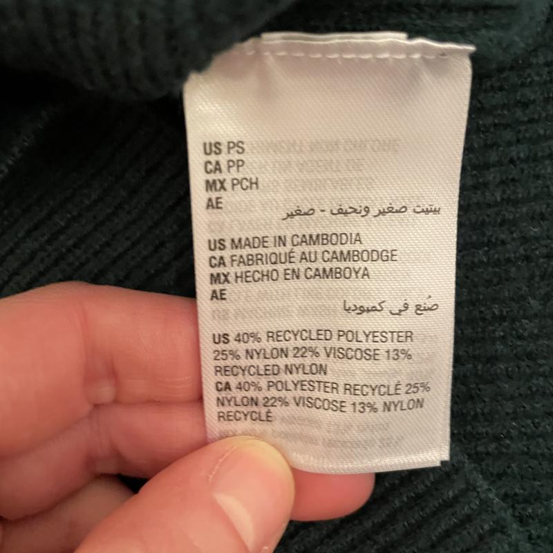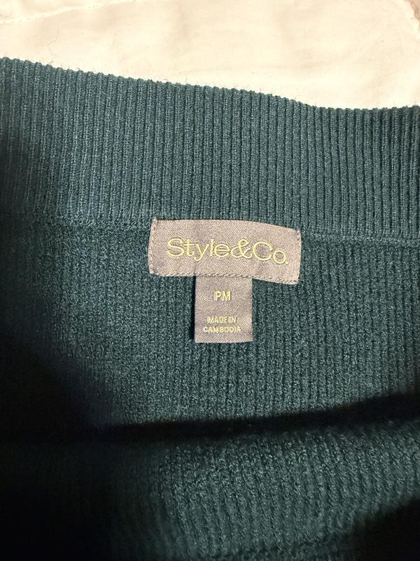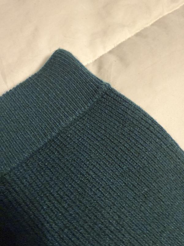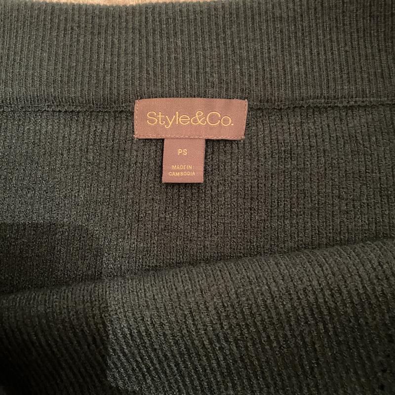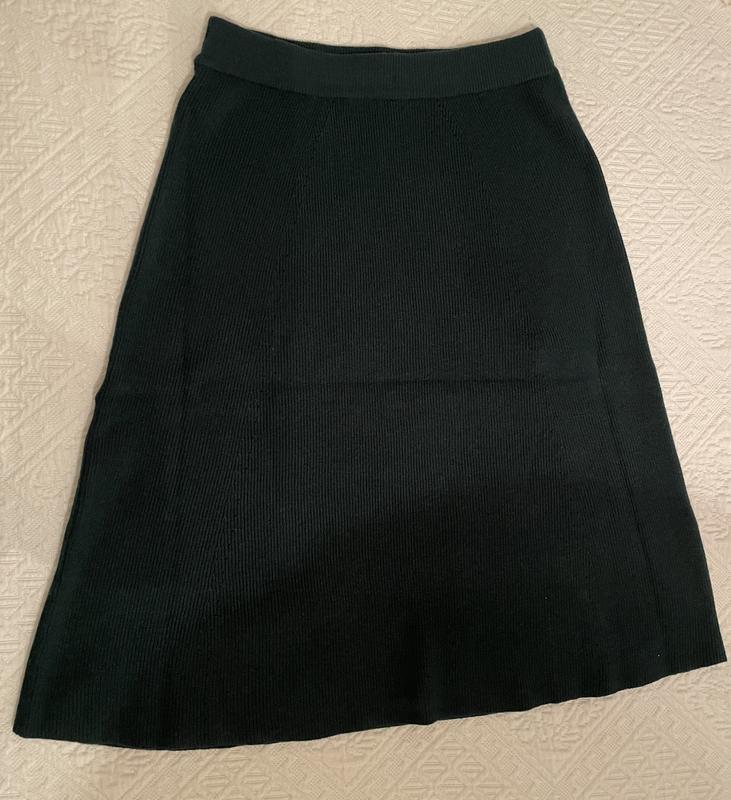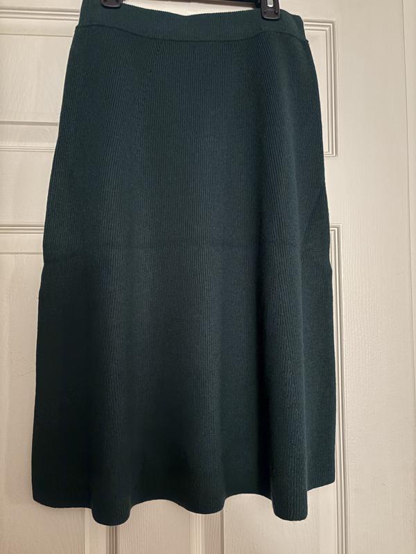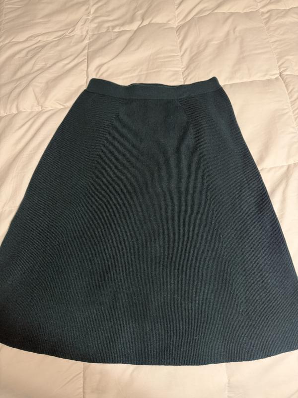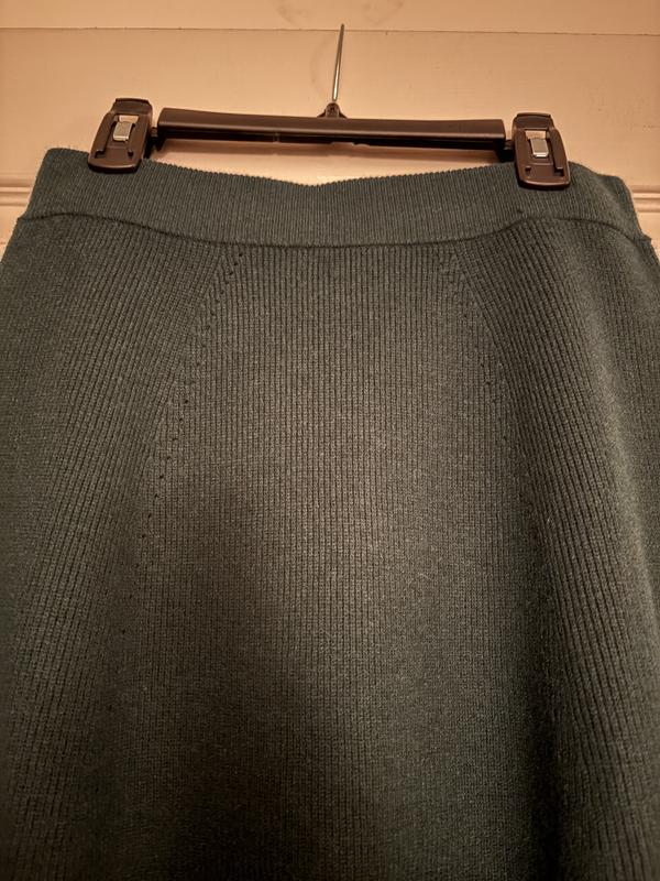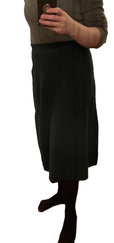 Soft form fitting sweater skirt with elastic waistband. The color is a deep forest green, perfect with a white or black blouse and boots for a holiday party. Hangs below the knee, with slight flare at the bottom. Size PP a great fit for 5’1” 105lbs.