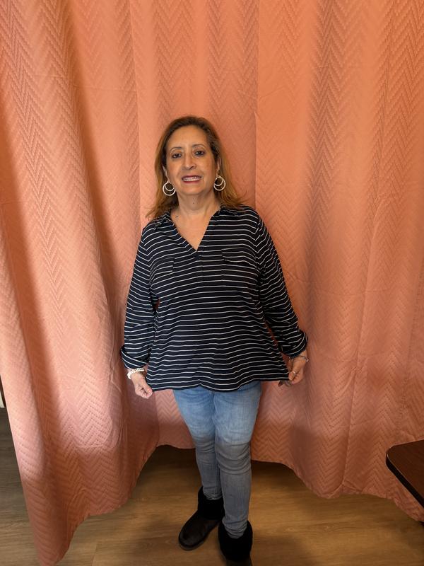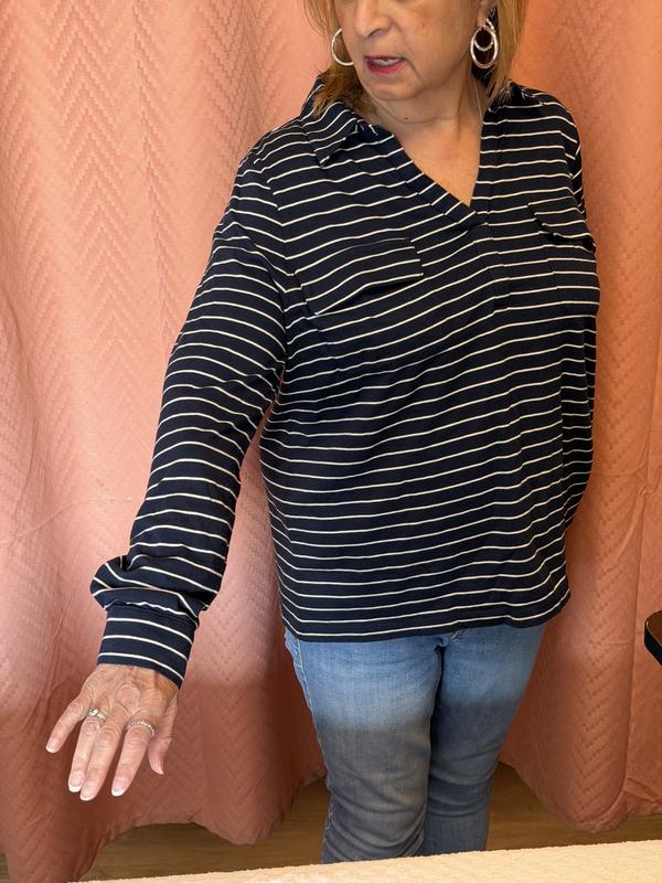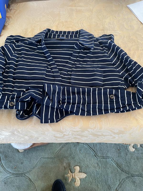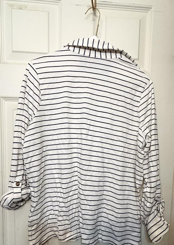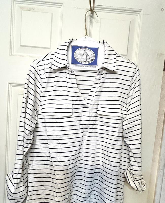 This shirt just doesn’t cut the mustard. The first thing I noticed was the sleeves. They are uneven and the buttonholes are far too small. You can wear the sleeves up by buttoning them. However, I wasn’t able to get either button through. I laundered it according to directions. It just didn’t hold up. Seam threads started fraying. The nautical look is cute, but the quality isn’t there