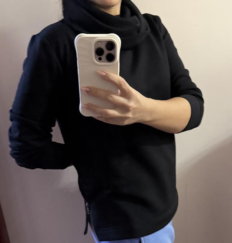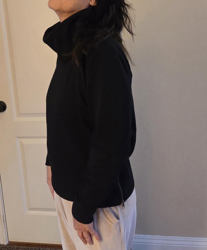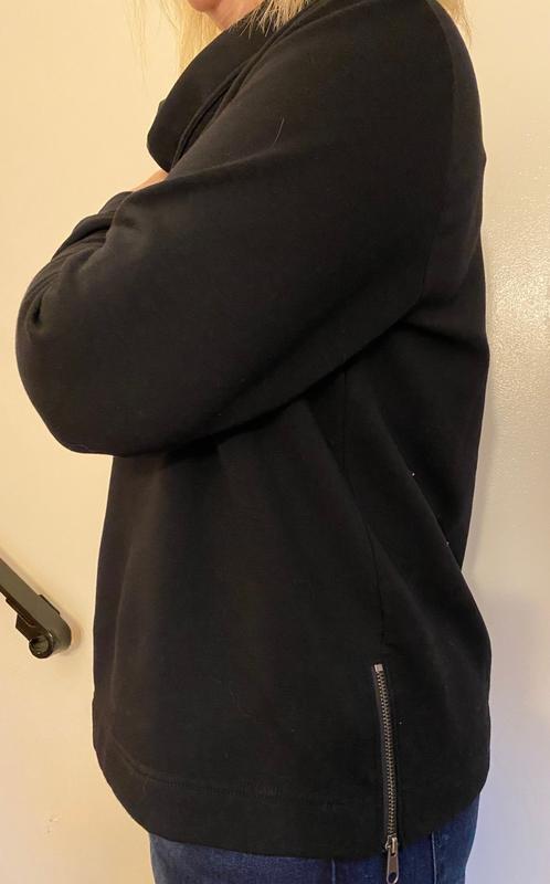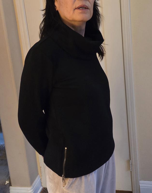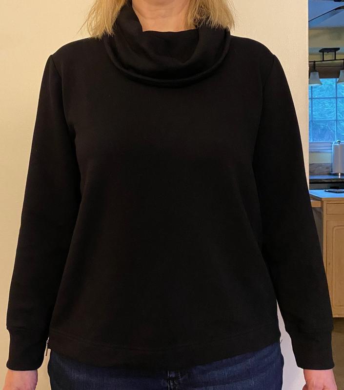 This is a cute sweater with zippers on the lower sides . Overall loose fit. The neck area feels a bit crowded for me. Would have liked to have less material around the neck .Cute for running out of the home for errands.