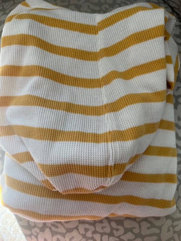 This classic striped Style & Co hoodie is lightweight, versatile, and incredibly comfortable. I love a layered look—for both style and warmth—and this top works perfectly paired with jeans or leggings. The waffle knit fabric (a blend of cotton, polyester, and spandex) feels soft, stretchy, and easy to move in. I machine washed and dried mine with the rest of my laundry, and it came out looking great with no issues. I’m not typically a petite, but the regular fit would have been too long in both the sleeves and torso. The fit of this hoodie is very relaxed. Even the petite fits a little looser than I prefer. I do appreciate the slightly longer back hem. It provides just the right amount of coverage. The hood lays smoothly across my back while the v-neck in front adds a nice touch. This is one of those tops you can wear just about anywhere. It’s a notch dressier than a basic sweatshirt, making it a perfect go-to piece for the fall season. I’m looking forward to wearing it often.