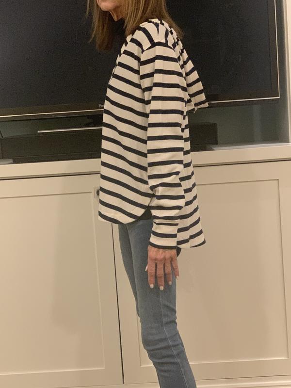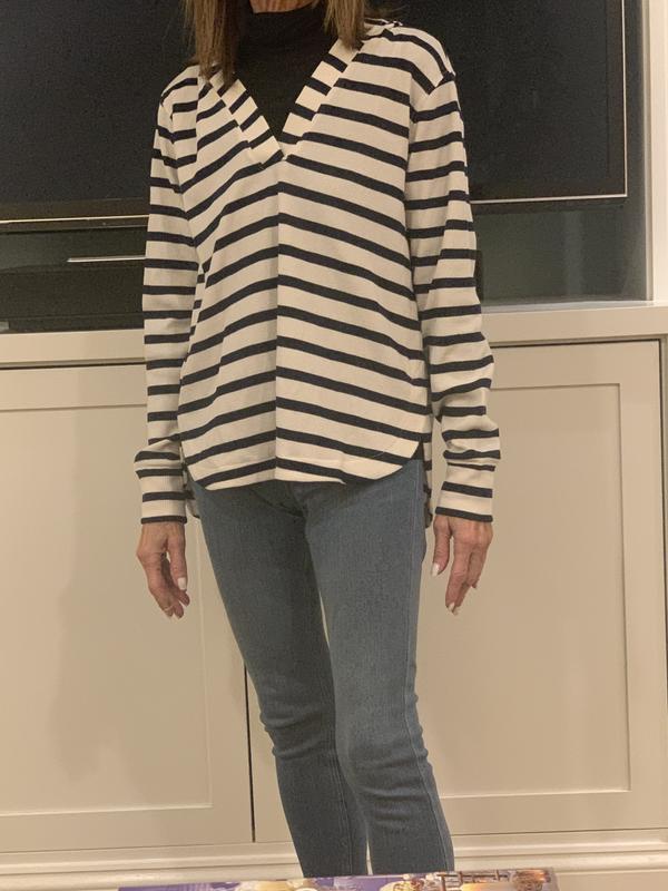 Very cute top. It does run a little big, a little full and sleeves a little long, but still would recommend it. Just size accordingly. Not a very warm material so if you’re planning on wearing it in the winter time I would suggest putting a turtleneck underneath. But would be good for spring and summer.