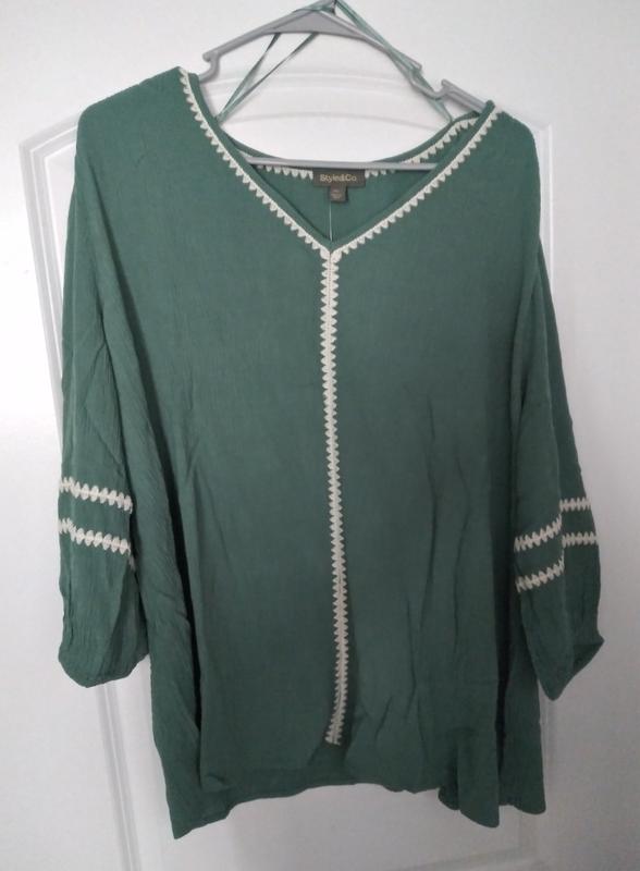 Nice top! I love the color. Its a pretty mint teal green color. I like that the fabric is lightweight and flowy. This top is comfy and has enough room so I can move easily without feeling restricted. I also really like the beautiful white embroidered stitching on the sleeves and down the front of the top. This top looks great dressed up or down. Very stylish! Love it!!