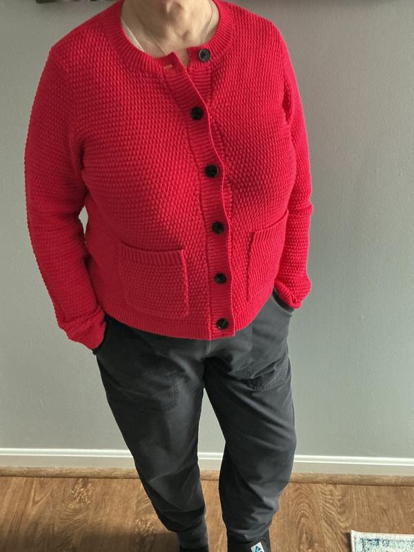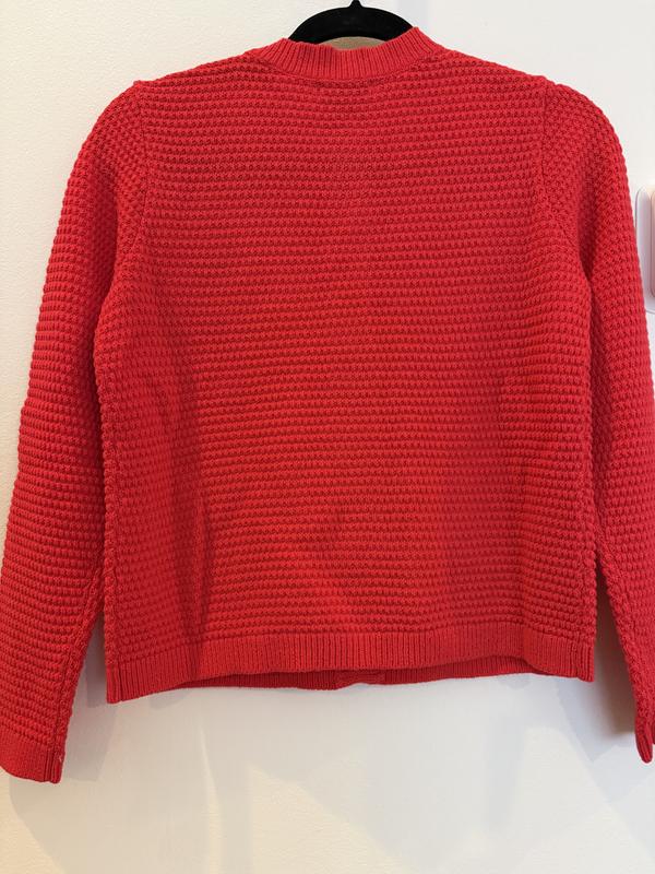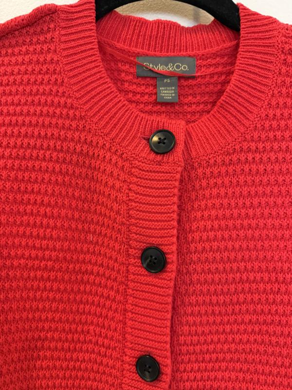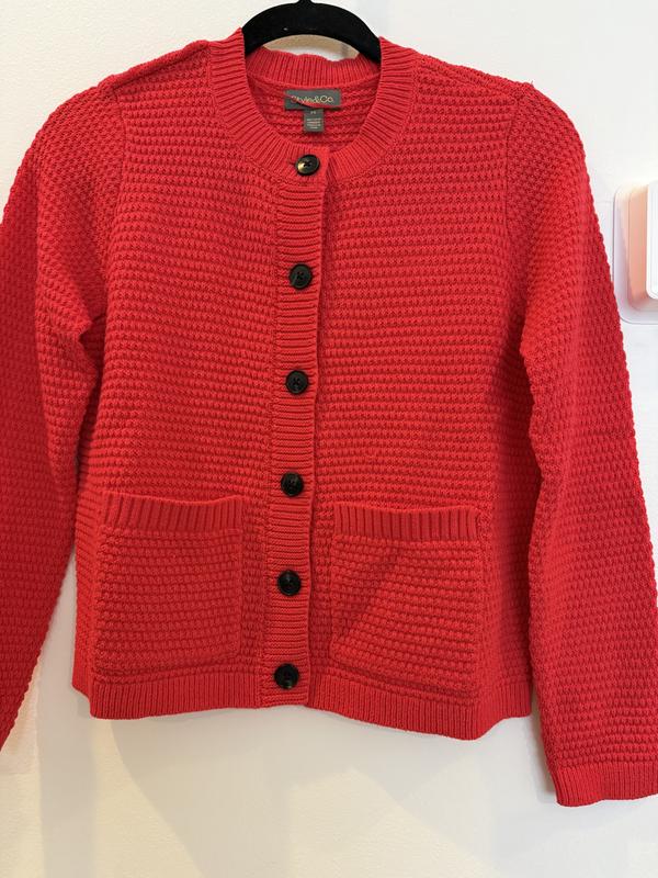 A very bright red spring sweater. Very soft and will be the perfect weight for spring. I have a large bust and buttoned up it was a bit snug thru the chest on me. It was a petite large size. I probably would never wear it buttoned up though. Cute sweater if you Iike very vibrant colors.