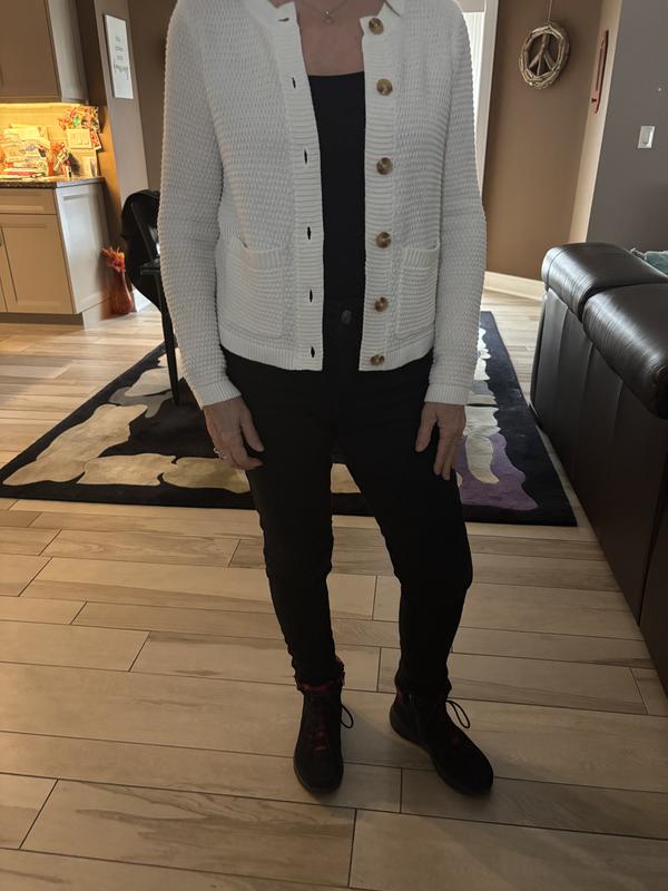 I got the petite medium and I really like that the sleeves are just the right size, I usually end up having to roll them up. The cream color is perfect for a spring outfit. The cardigan is light, the buttons and front pockets add a cute touch.