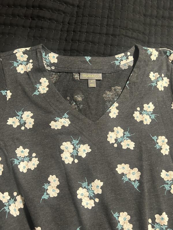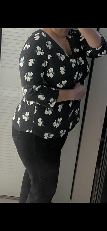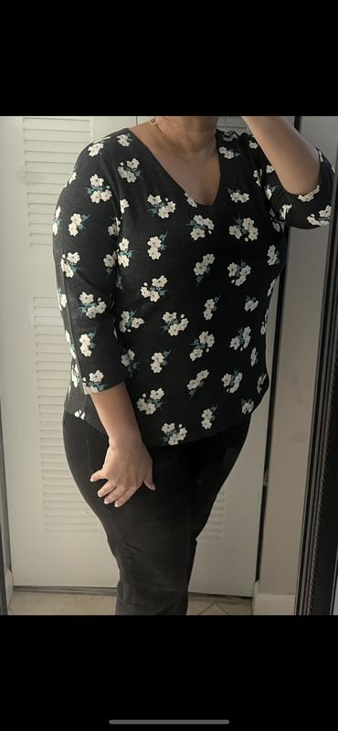 This top will be for my sister - love the v-neck and the print. The material could be better. Prefer a stretch knit. Proportions are good for a petite - the length on the back could be a little longer - overall nice top.