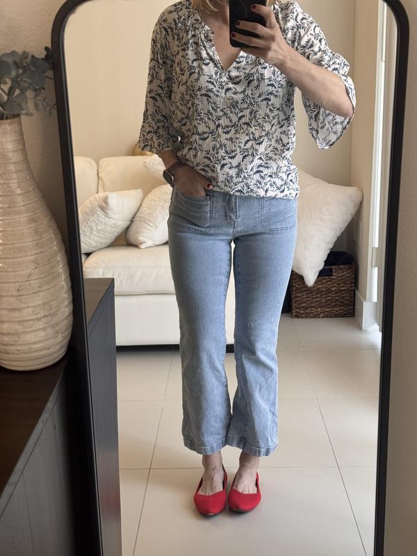 Comfortable and stylish top. Fabric is 100% made of recycle materials. I have senestive skin and the fabric didn’t worry me. Washes well and keeps shape even after low tumble dry. Great top for traveling . The V neckline is low so this maybe disappointment some people but I won’t consider it a work top, casual summer/spring go to top.