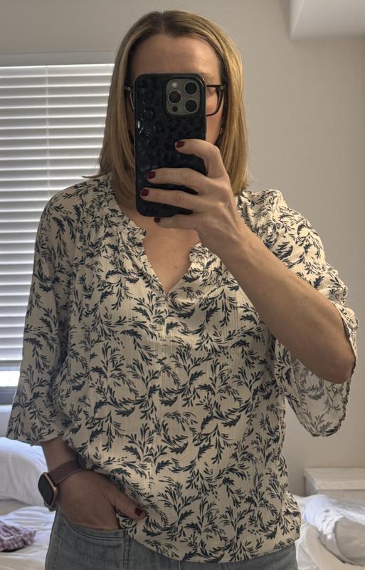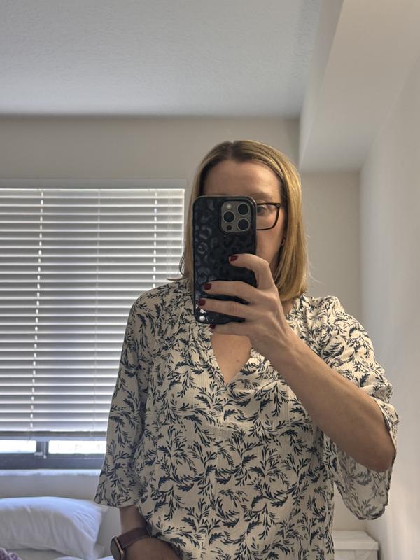This is a dressy top, I got the white floral so it looks younger when wearing it. Even though the neckline front split a little low but overall the top is cute and the length is perfect. The size is true.