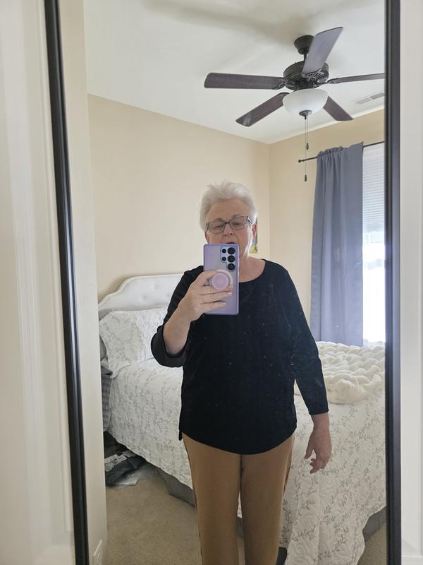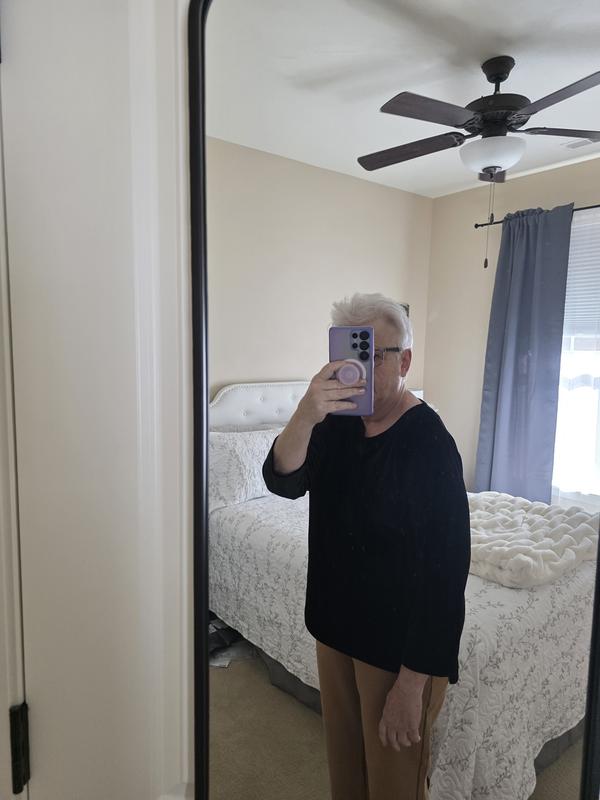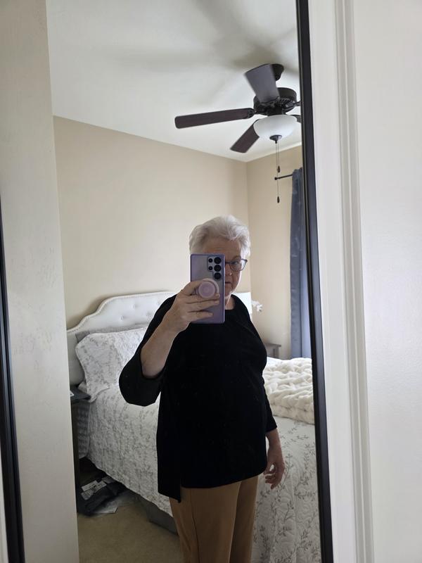 I love that I can dress up or go casual with this velvet top. It does have an odor to it, which I hope will resolve after washing. More colors please (purple, teal, etc.).