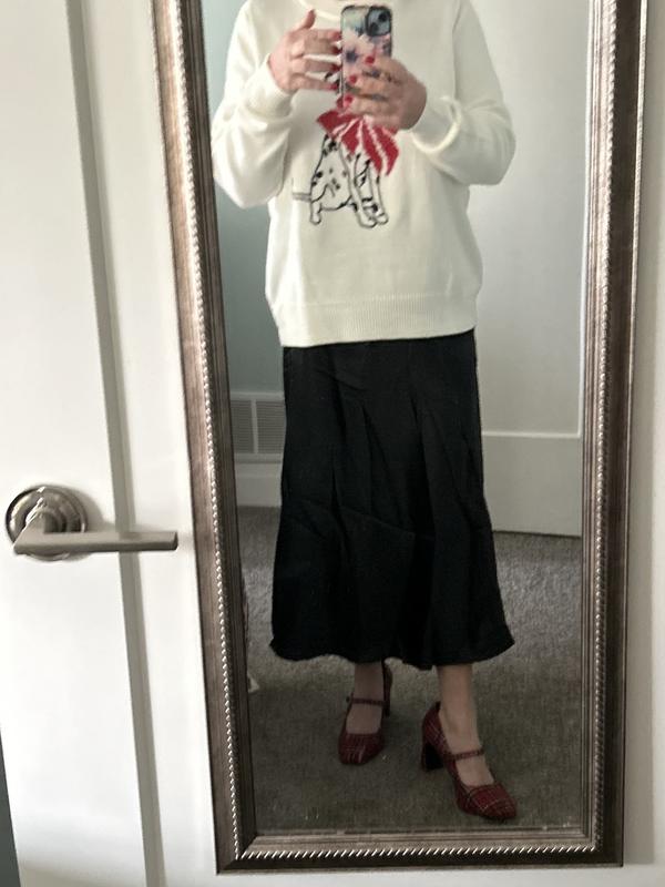 this sweater goes well with jeans, dress pants or a skirt. It is festive and comfortable