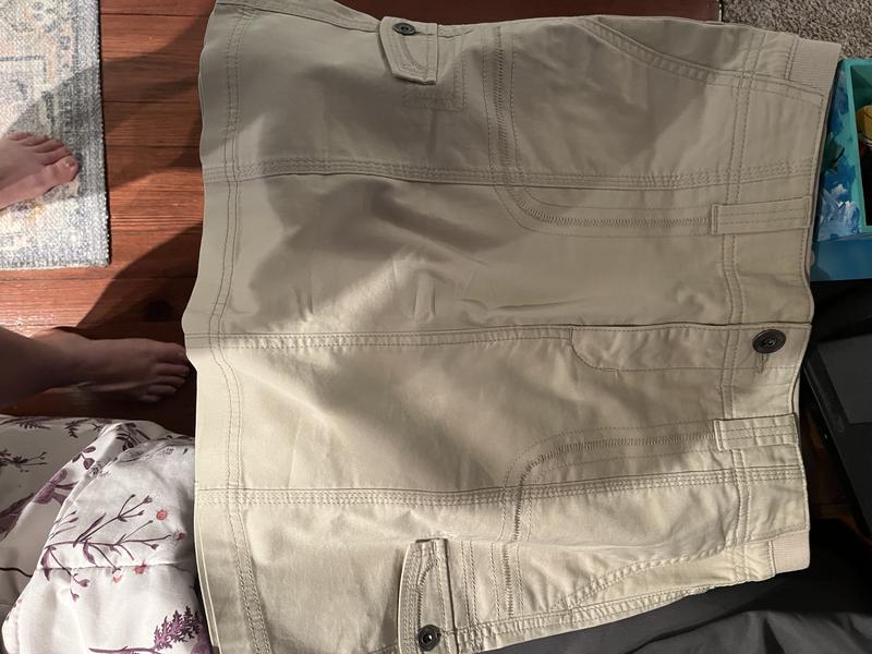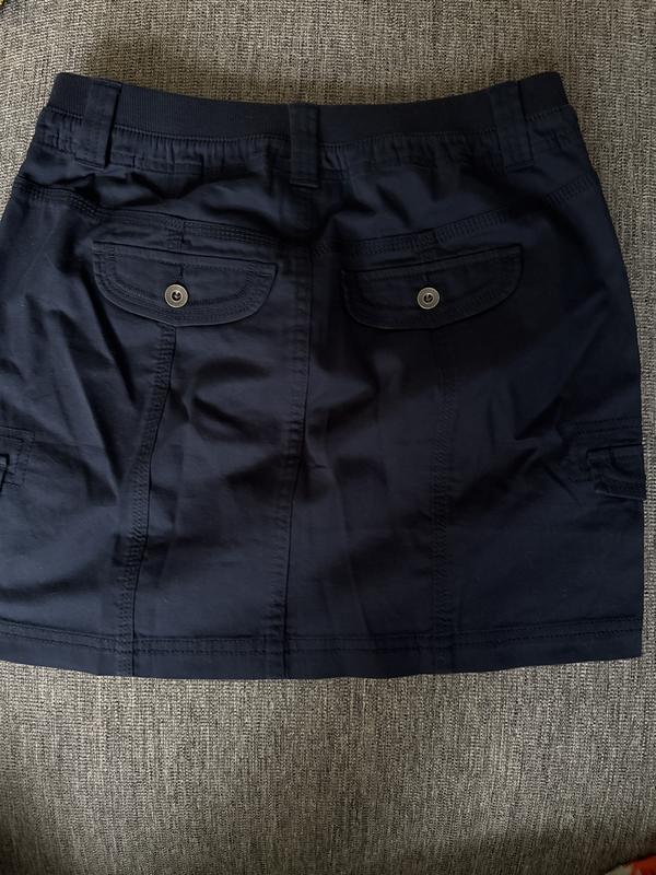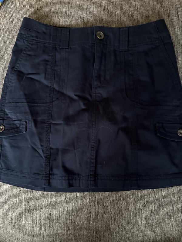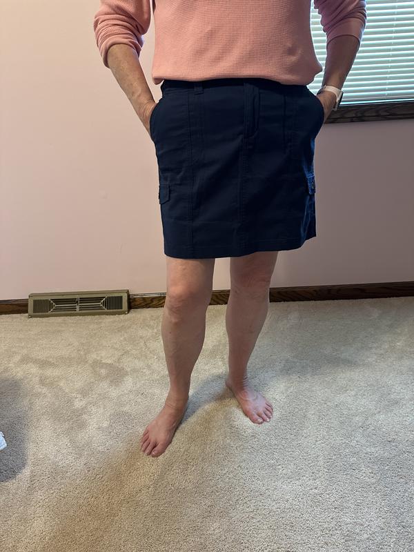 Nice everyday skirt. I'm actually a petite large, but the regular size was longer. This hits me a couple inches above my knee. Nice casual skirt, I bought the stone color. Lots of pockets.