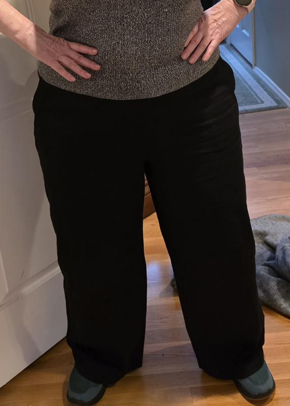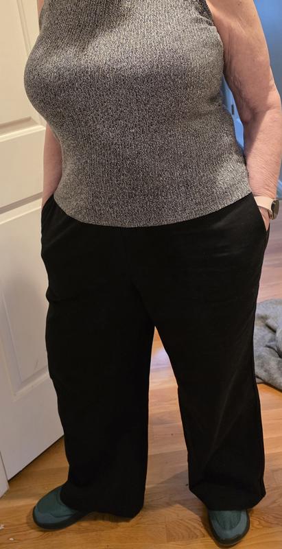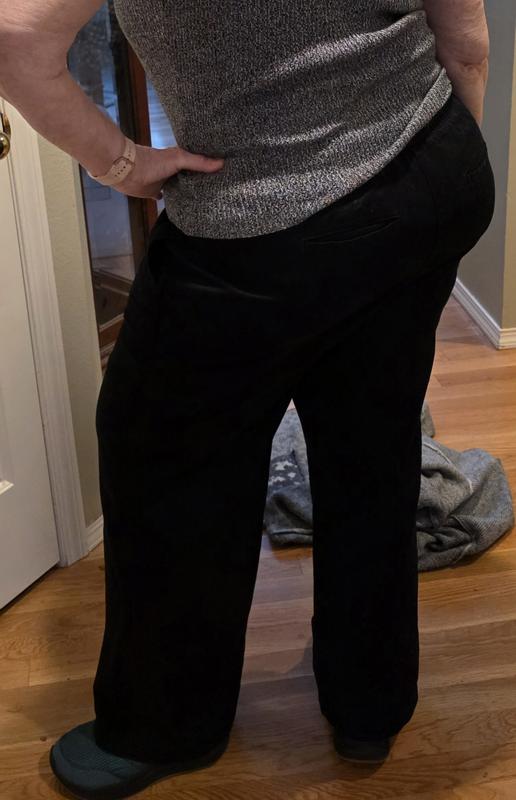 I really love these pull-on elastic and drawstring pants. The fabrix is very high quality, with fall/winter weight twill. The 2 side pockets lie flat and keep the lants very flattering. The pockets in back add a very nice design feature. They are soft to the touch and feel super comfortable. The fit was exactly what I'd hoped from adjustable waist through the hips and for length. I'm 5'5, 220 pounds, and got the plus size 1X.