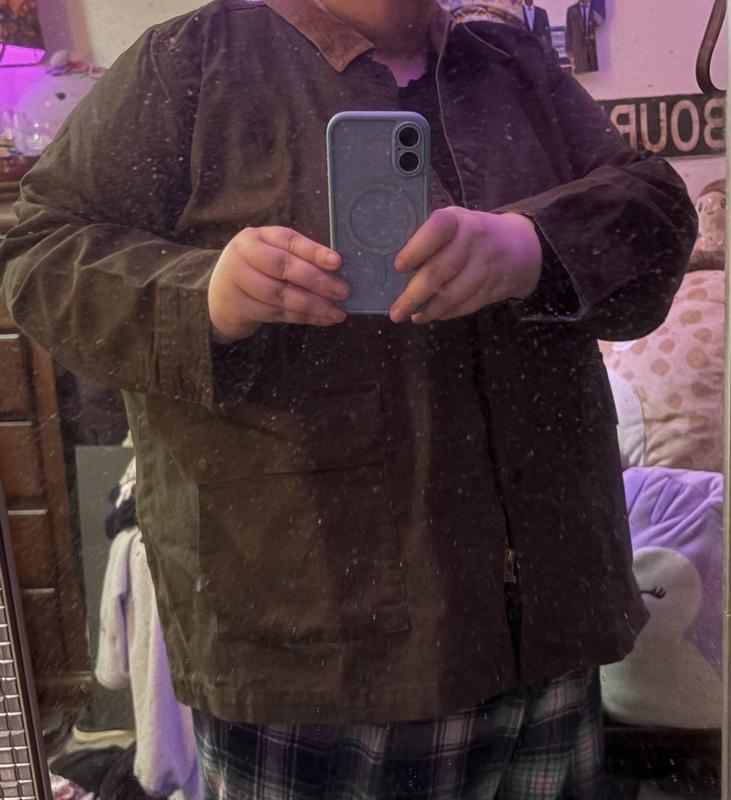 I was so happy when I received this jacket. I wasn't sure how I'd like it as the description and picture (missing picture) left me guessing a bit. I ordered the jacket one size bigger though the regular size would have been just fine. I wanted to make sure I had plenty of room to wear with layers and be able to move around if I'm working outside. It has snaps in front but also has a zipper behind the snaps to ensure a nice, warm closure with no gaps. The canvas sheds water nicely and the decorative cuffs and collar give it a nice touch. So far it's been plenty warm for this very cool and wet fall. I beleive with some layering it will take me warmly well into the first half of winter. The colors (not my normal pallet) are wonderful. Very appropriate for the season and the type of clothes I'll be wearing for the next few months. I would definitely recommend this to friends and family!