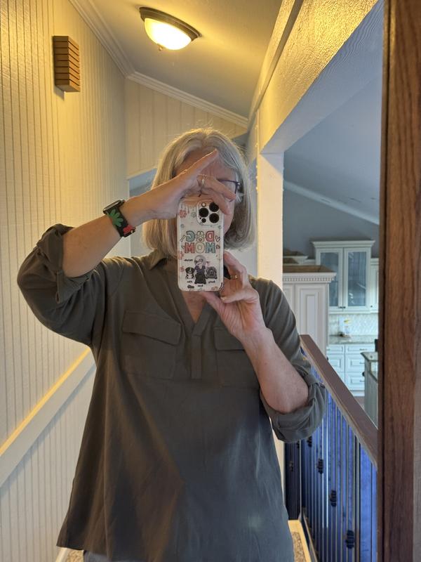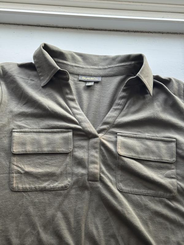 Soft knit style is fashioned with flap pockets on this Style & Co plus size knit top featuring sleeves that can be rolled up to 3/4-length or buttoned down to the wrists.