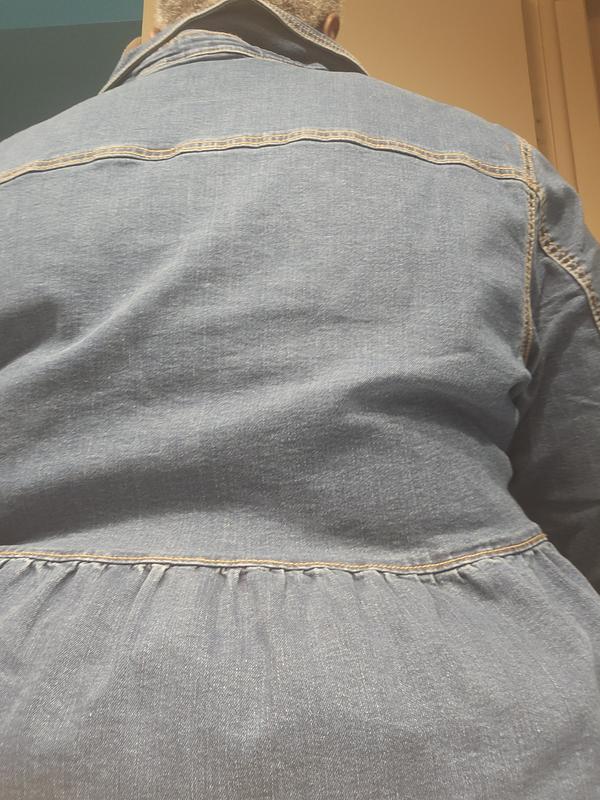 This jeans jacket is not a Harvey jacket. It’s light weight. The peplum is pretty straight, no pleats to it. It’s just an extended part of the jacket no detail to it. Silver buttons and gold threading. Very simple, something you’d throw on to run errands.