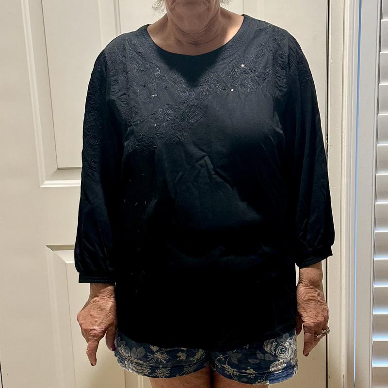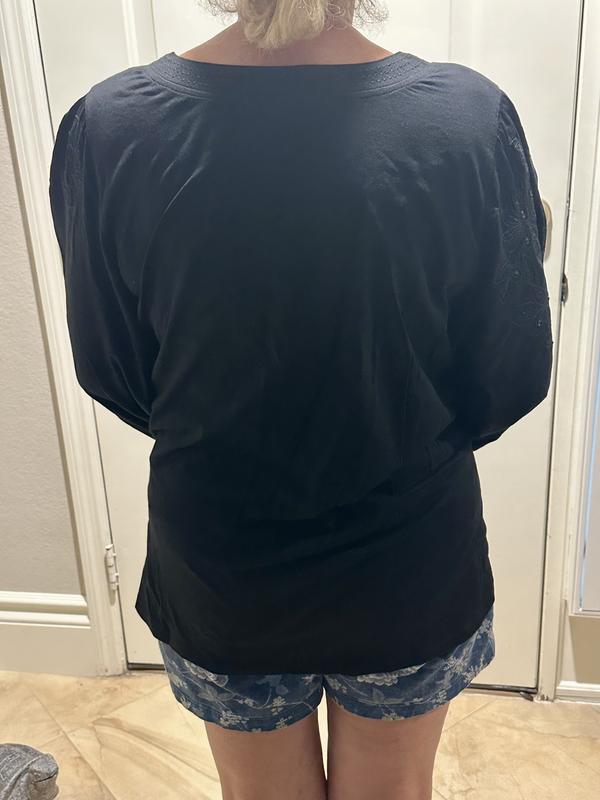 This top is comfortable to wear and has just enough embellishments. I normally wear an xl but this 0x fit perfectly. The sleeves don’t have elastic or much give but they are made wide enough to be comfortable. Great for jeans or work.