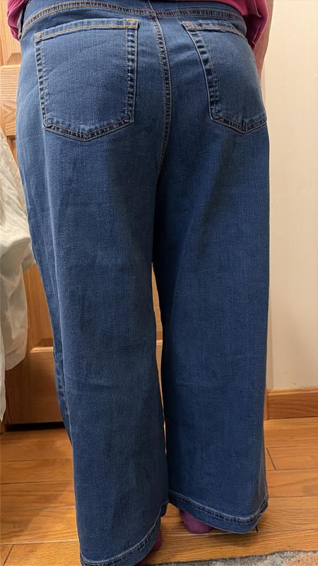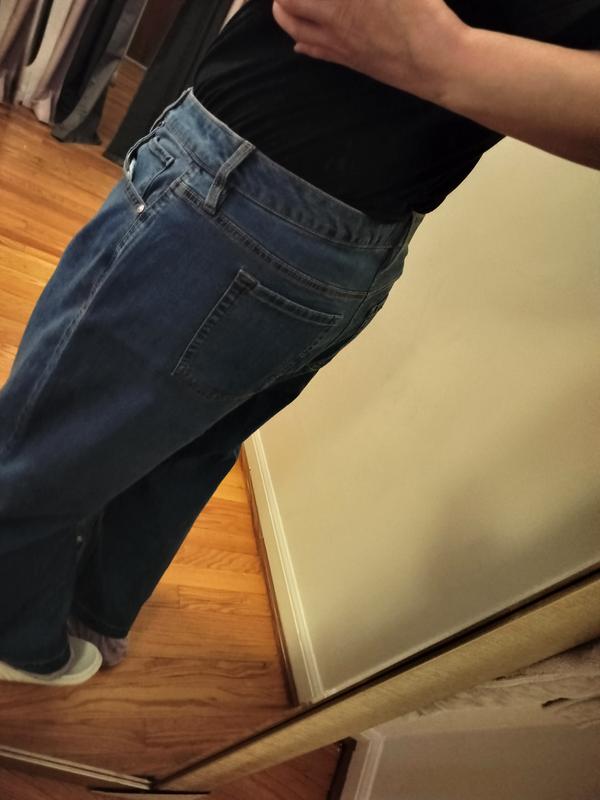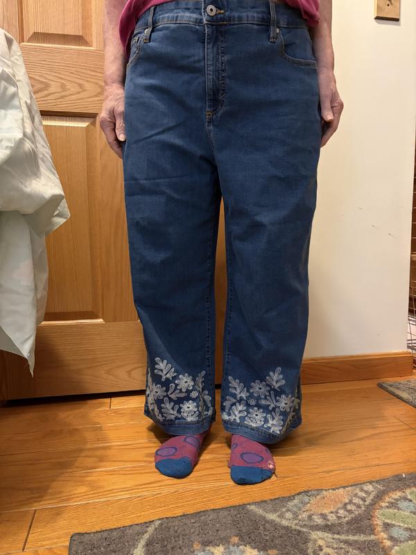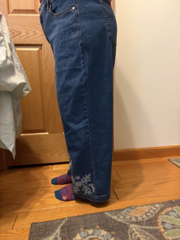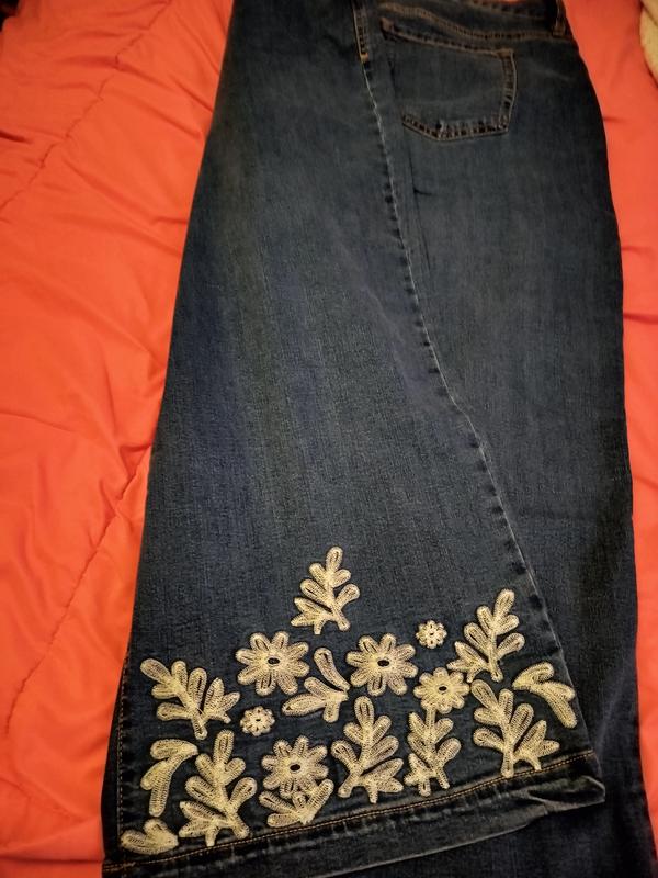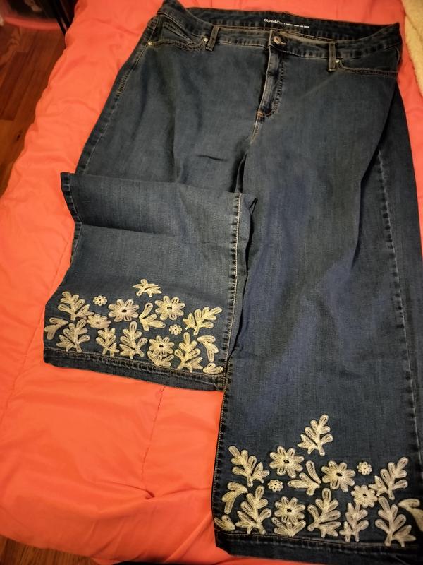 Unfortunately, I was disappointed with these Styling Company five-pocket wide-leg jeans with the white floral embroidery at the bottom. The jeans were much too big and far wider than expected, and it appears the wrong size was sent. Because of the oversized fit, they were unflattering and not wearable for me. While the embroidery detail is nice, the sizing issue completely overshadowed everything else. I would recommend double-checking sizing before ordering, as this did not match what I selected.