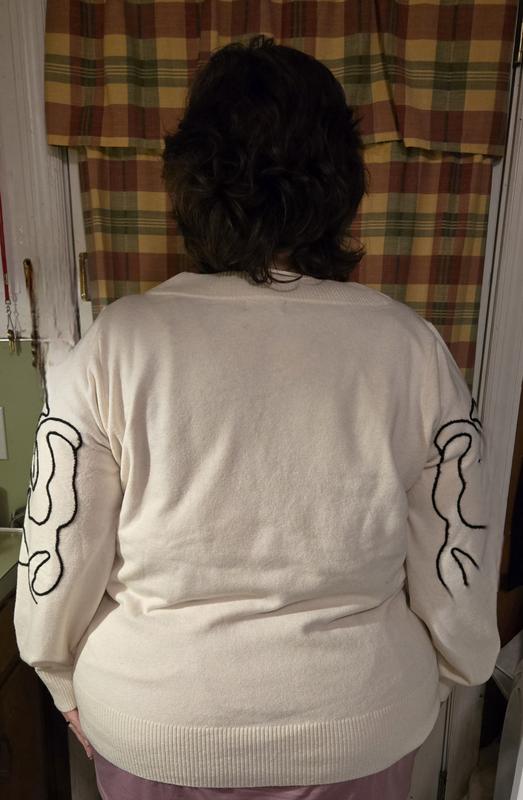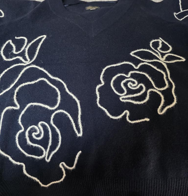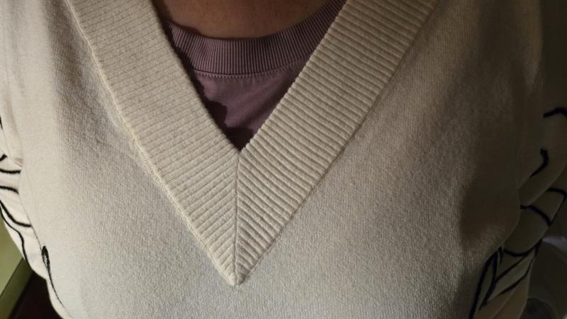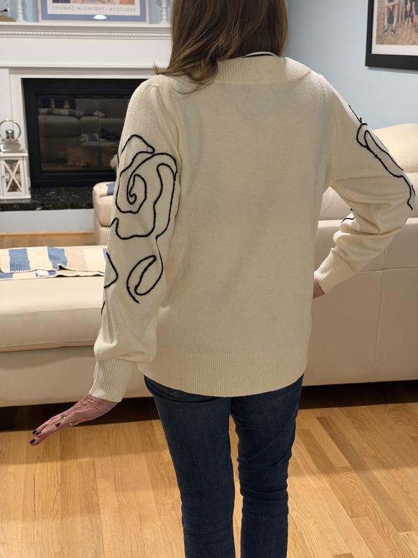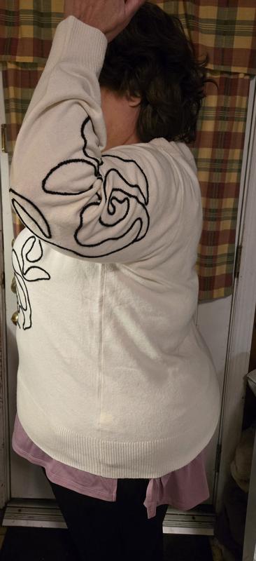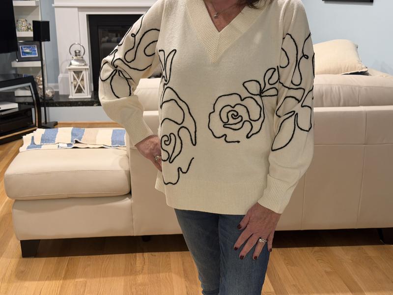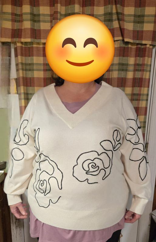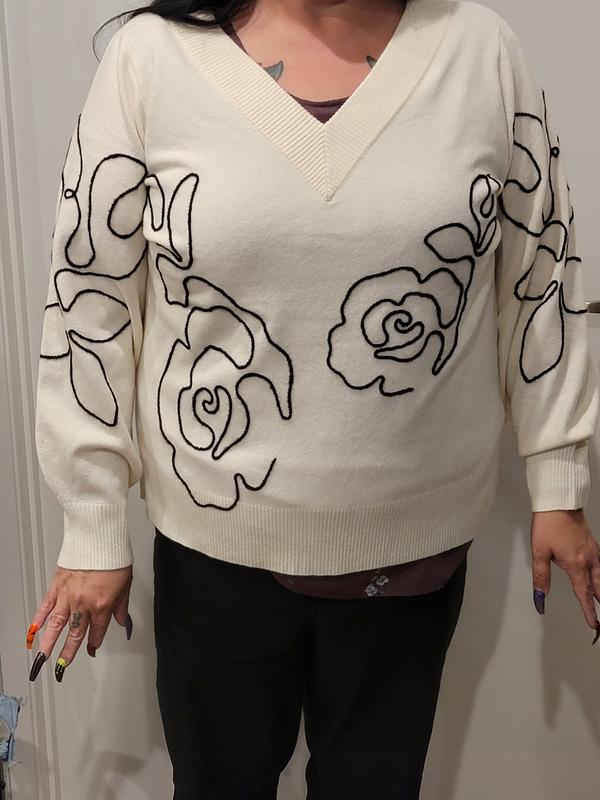 I was pleasantly surprised with how much I liked this sweater. It is very soft and the embroidered flower design adds a very stylish upgrade. I ordered a Plus 0 which allows me extra room for an oversized slouchy look. Long Sleeved, v-neck fits my style perfectly. Totally plan on this becoming a winter staple for my wardrobe this year.
