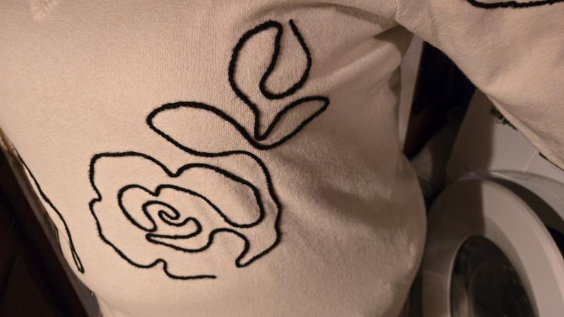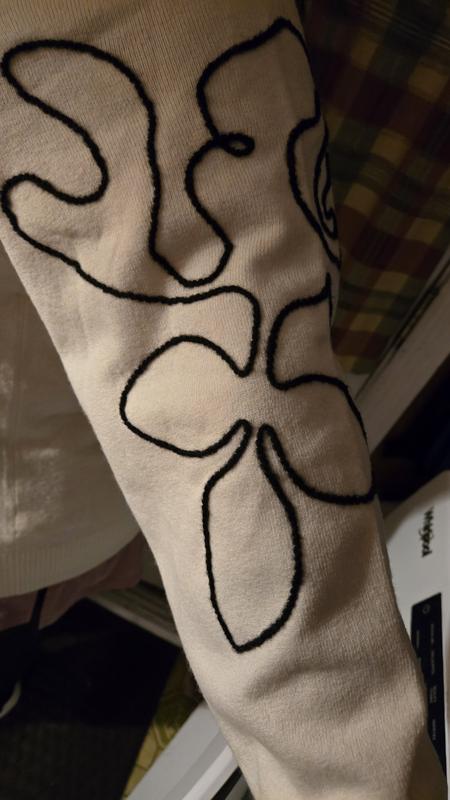 Light weight soft comfy sweater. Perfect for petites as this runs short. The flower stitching is a yarn . Wore with my loungy joggers in the house and felt cozy. Wore with jeans.