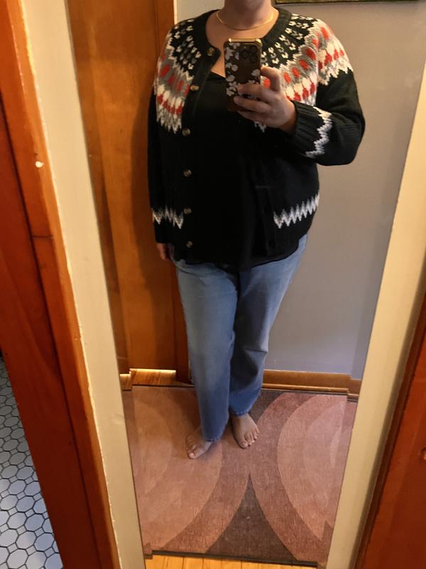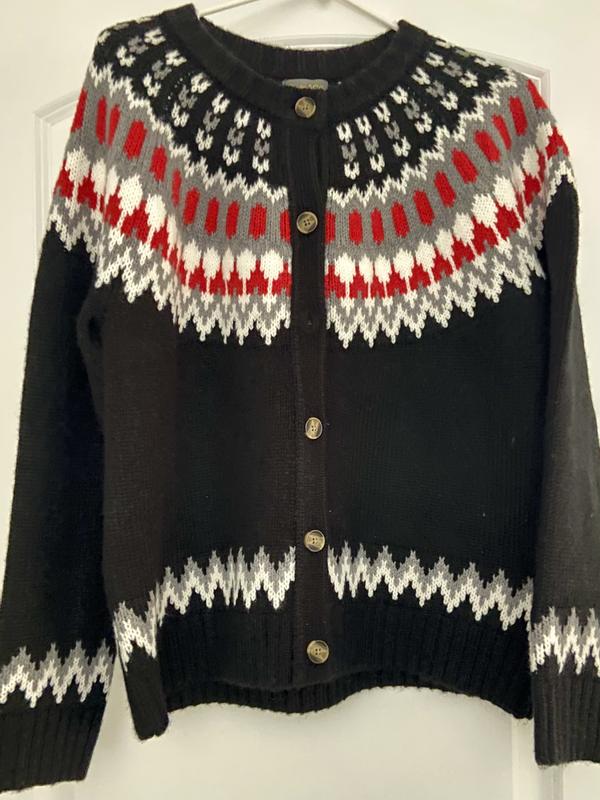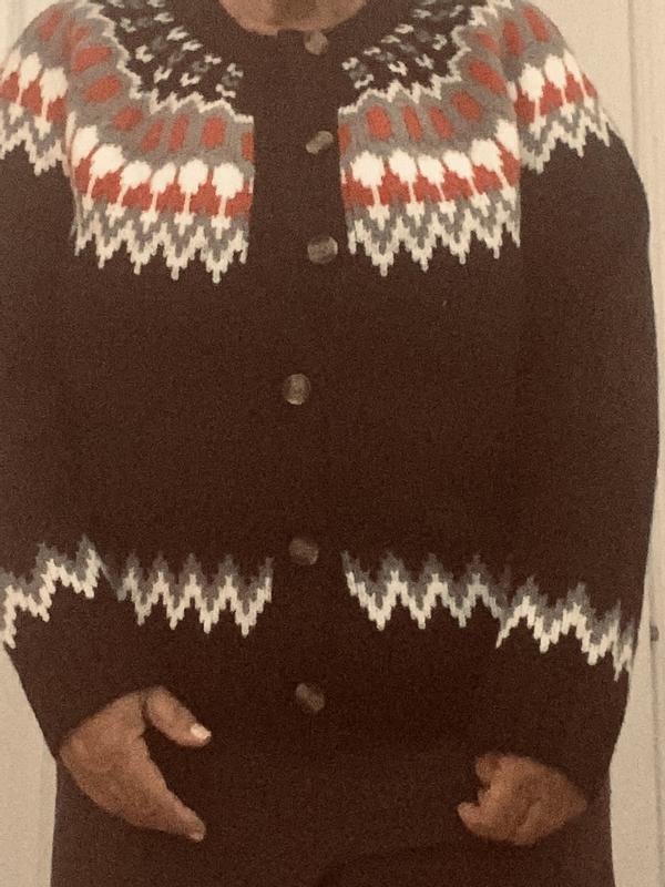 I love how cozy this sweater feels. It’s a warm hug on a cold day. The Fair Isle style is timeless and classic. The colors complement each other. The detail down to the buttons are perfect. Versatile enough to wear with your favorite jeans or dress it up with a nice wool skirt. It runs true to size. I am usually a L/XL but I sized up to a 1X because I wanted it a little oversize.