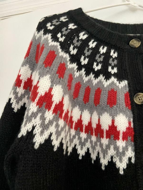 Really cute fair isle sweater. The pattern looks even better in person! I ordered one size up from my usual and I’m glad I did; it fits comfortably and has that slightly relaxed look that works well for layering. The material isn’t too itchy (which I was worried about), so it’s wearable all day. The only downside is that the buttons feel a little cheap, but overall it’s a cozy and stylish sweater.