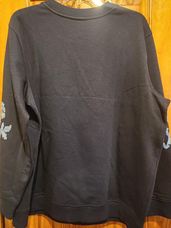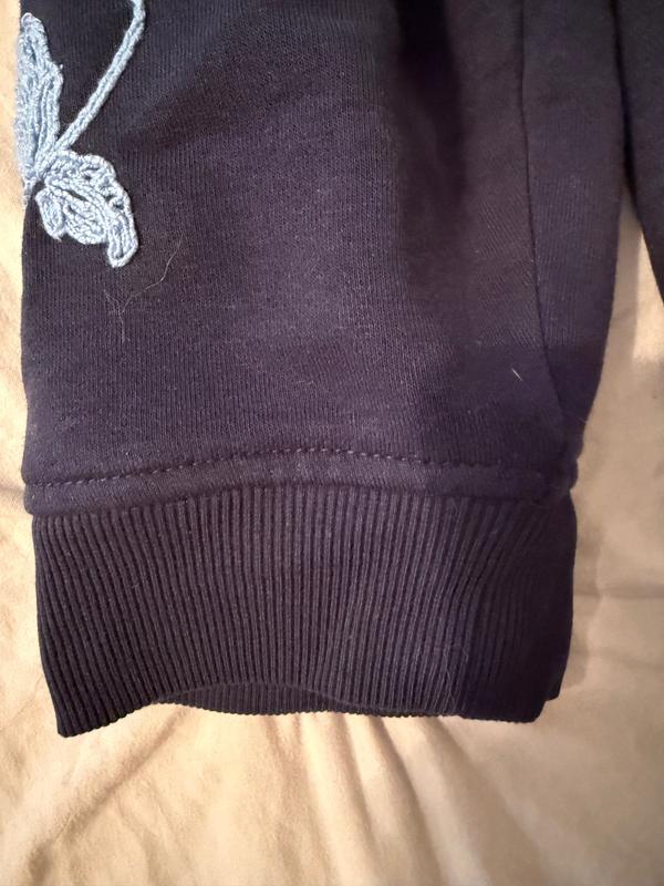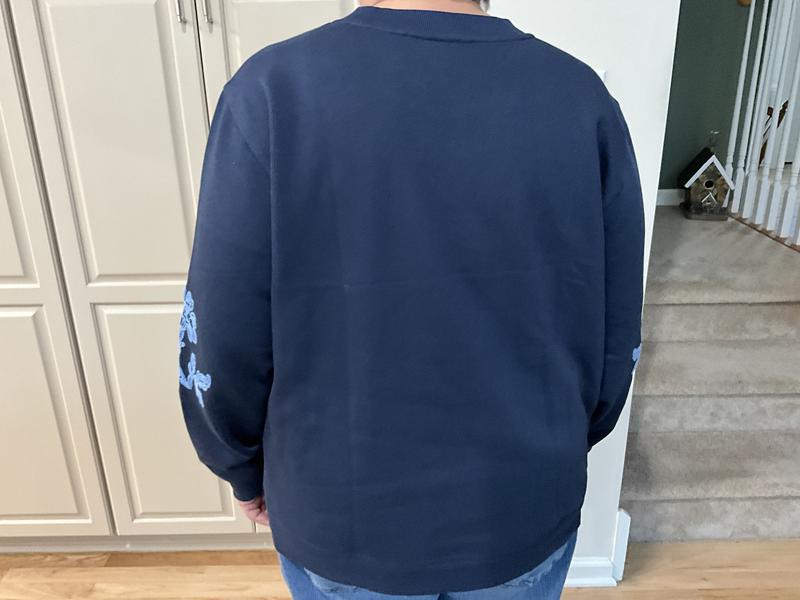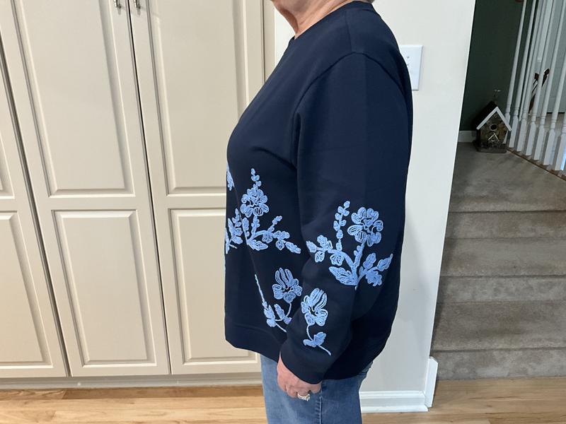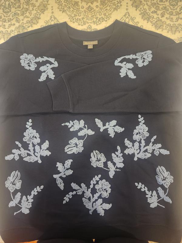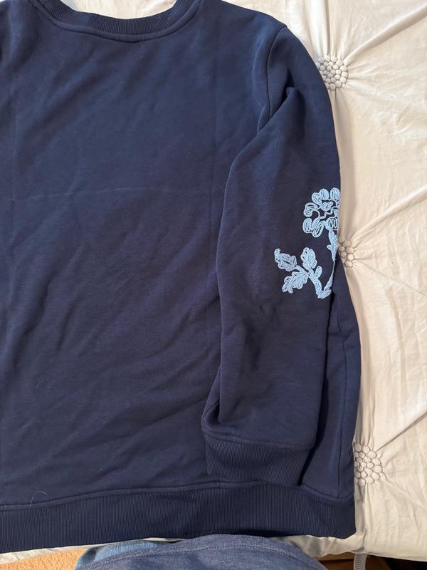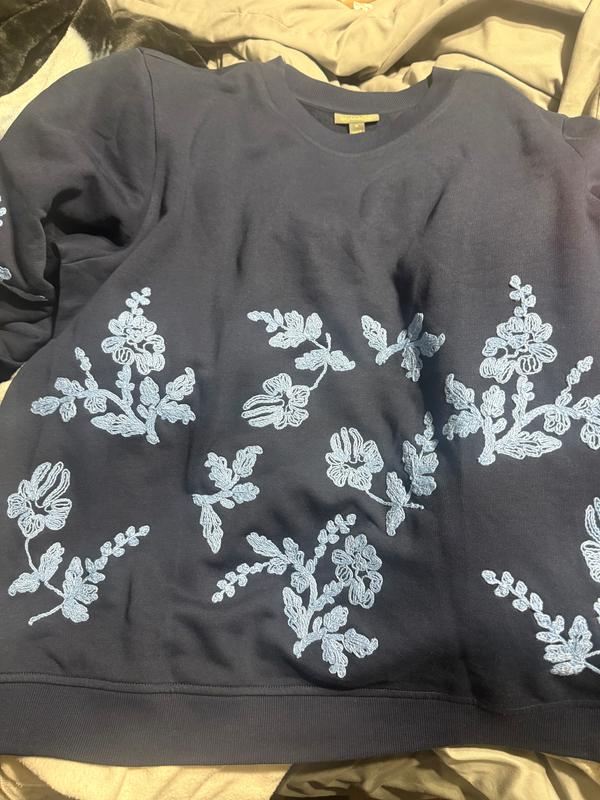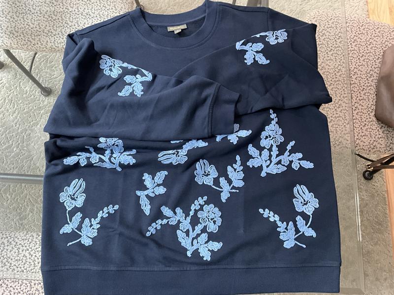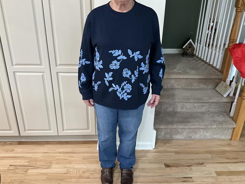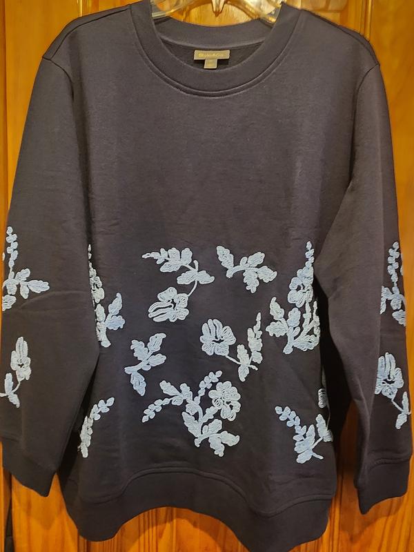 I love this sweatshirt. It’s navy colored with light blue embroidered flowers on it. It looks great with jeans and elevates any casual look. It’s a sweatshirt , so along with lookin stylish, it will keep you toasty in the cold months can be worn, sporty or even out to dinner very versatile