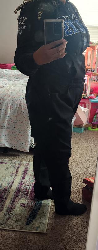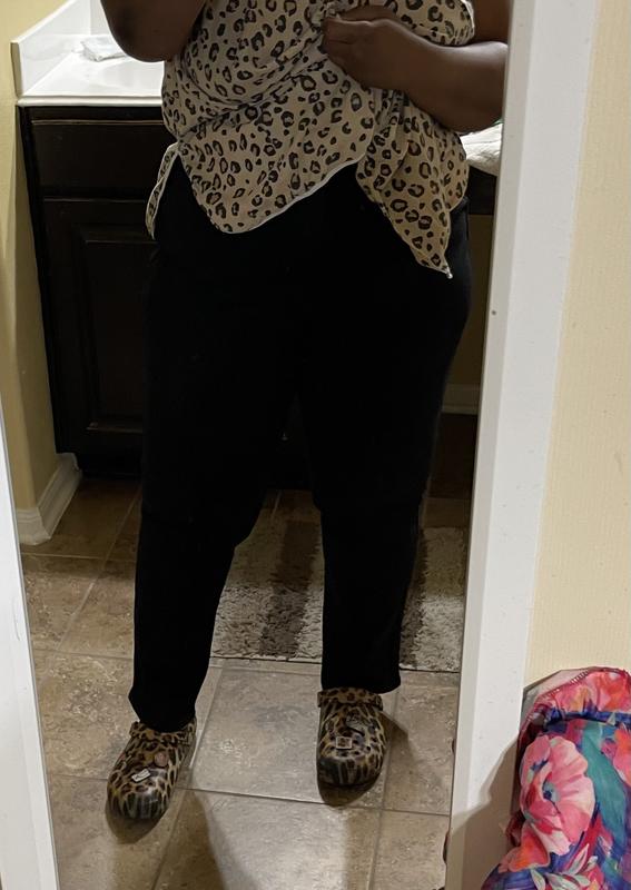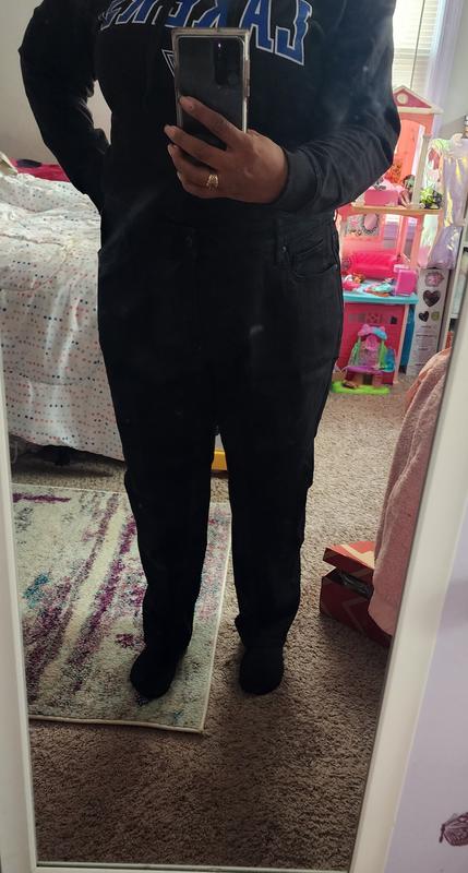I have a large butt in comparison to my tummy and waist. These fit, I can get them on, they come up high enough to cover in the back without coming up to my ribs in front. Length is perfect, I like my pants at 30". Nice substantial fabric and I like the dark color.