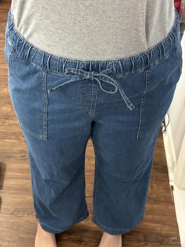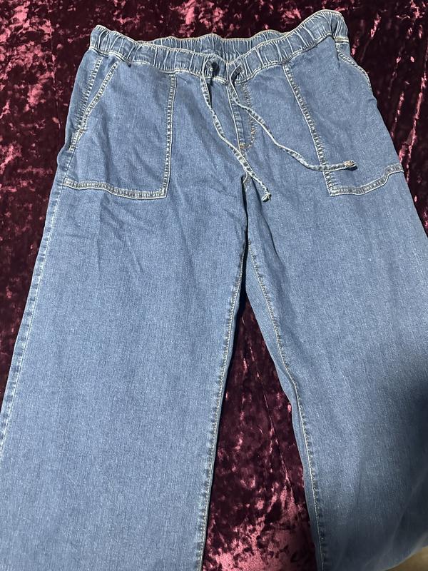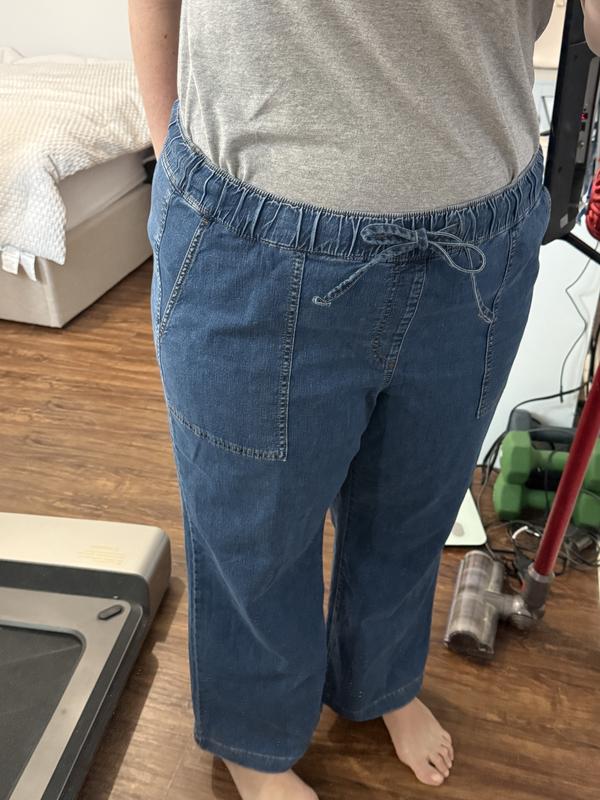 I love these pants, but I should have noticed the length--they are too long (I'm 5'3" and there's about 2 in. over my feet). I'll keep them and get them altered. Fits me nicely and are very comfortable. I like soft denim and these are not restricting. True to size but consider whether worth buying if you are short.