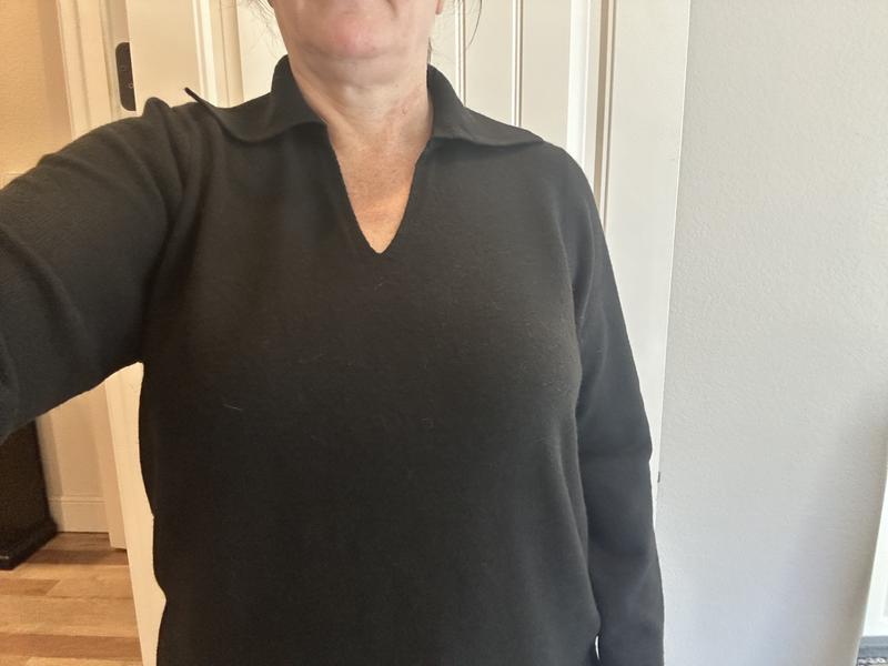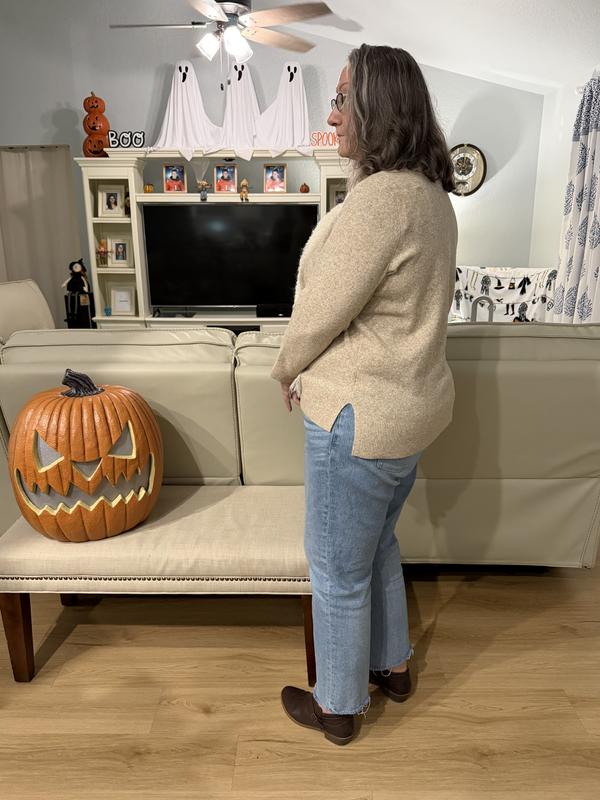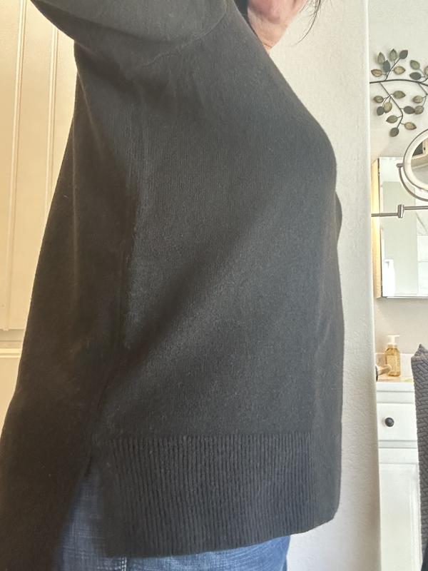 This is my go to sweater! With the temperature in the upper 50’s I can throw on my sweater with a scarf and jeans with boots and be on my way. Very soft and lightweight, very stylish and durable. I love having the back longer. It is so cute- football games or just running errands, it’s a win for me! Sizing is accurate , I am 5’9 and have length in arms and sweater.
