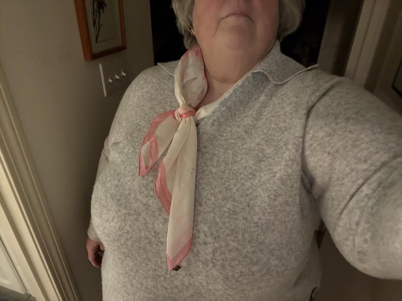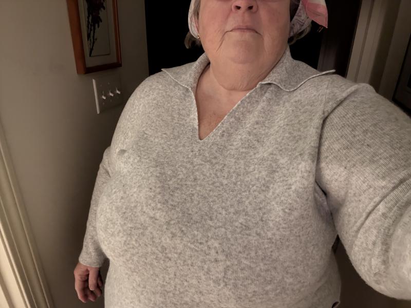 Light in weight, but soft and warm, this sweater is my new favorite for the fall season and I think it will carry on into winter. Wear it with jeans or dress it up with a pretty scarf. Mine is a lovely pale, pearly shade of gray that complements a wide range of outfits.