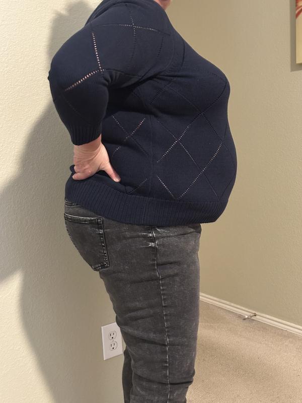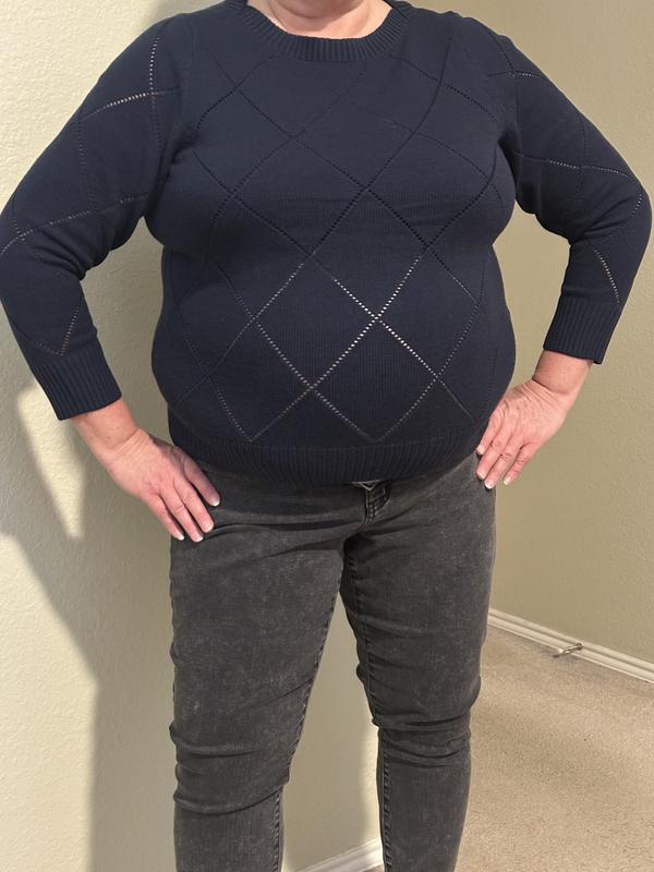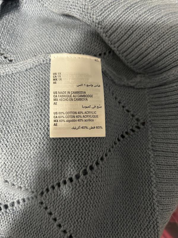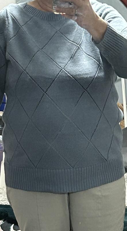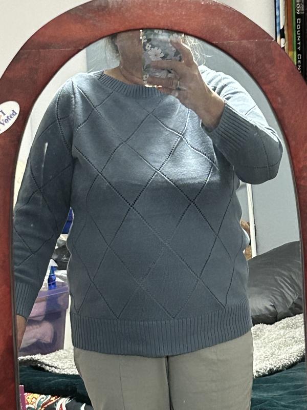 This Style & Co 60% cotton soft sweater is adorable on the rack but it's sizing hugs me in the wrong places. I sized up to wear baggy but it fits a size down instead. The color works well and the sleeves are perfect with longer wrist lines. It would look cute dressed up or down.