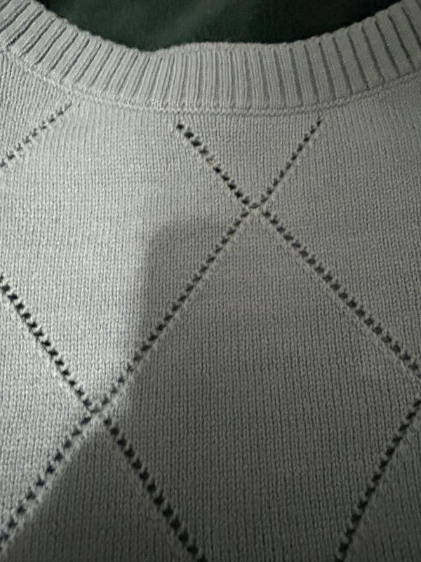 This is a really nice sweater! It is 60% cotton which makes it great for all seasons and makes washing and drying easy. The blue is a very pretty eggshell blue. The neck has an envelope shape which makes it unique and the pointelle is very nice also.