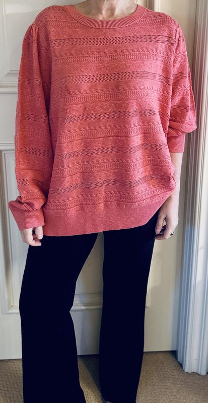 This is a nice, lightweight sweater that is airy and comfortable to wear. I love that the fabric content is over half cotton because it helps to make it breathable. I am 5'3", 115 pounds for reference and normally would wear a regular size small. But, I liked the idea of this being worn as an oversized, boxy sweater for casual summer days so I don't mind that fact that this is not my typical size. I might order another one in my usual size in navy because it will be nice to wear with jeans once the weather warms up. It's interesting the color is called spring strawberry because my first impression was that it was more of a coral peach color, but I guess it skews somewhat pinkish. Overall, it's a comfortable and easy to wear sweater that is great for spring and summer.