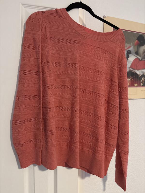 This is a nice sweater. It is fitted and parts of it are sheer so you will need a cami underneath. The strawberry color is very cheerful and a great color for spring. I ended up returning bc it was too fitted for my figure and a little shirt in length.